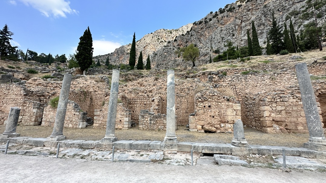 Since the Temple to Apollo, wherein the Oracle practiced, was built (way before Christ), lots of things happened to it, there was some reconstruction, and now there are some very well-preserved ruins! Ge’s (the goddess who gave order to the chaos that existed prior to creation as the Greeks knew it, navel (a cone-shaped boulder) rests by the temporary altar of the Oracle, and the gods’ preferred tree, a laurel tree, overlooks the Oracle’s temporary ruling site. The ruins of the Temple to Apollo dominates the site. All of these are accessible only after climbing stairs, marble-studded slabs, broken concrete steps, and such, LOTS of these along the side of a rocky Mount Parnassus, in today’s HOT temperatures! Still, though, a fascinating sojourn into the very distant past! Once again, our tour guide was extremely knowledgeable and brought Greek history and mythology to life!