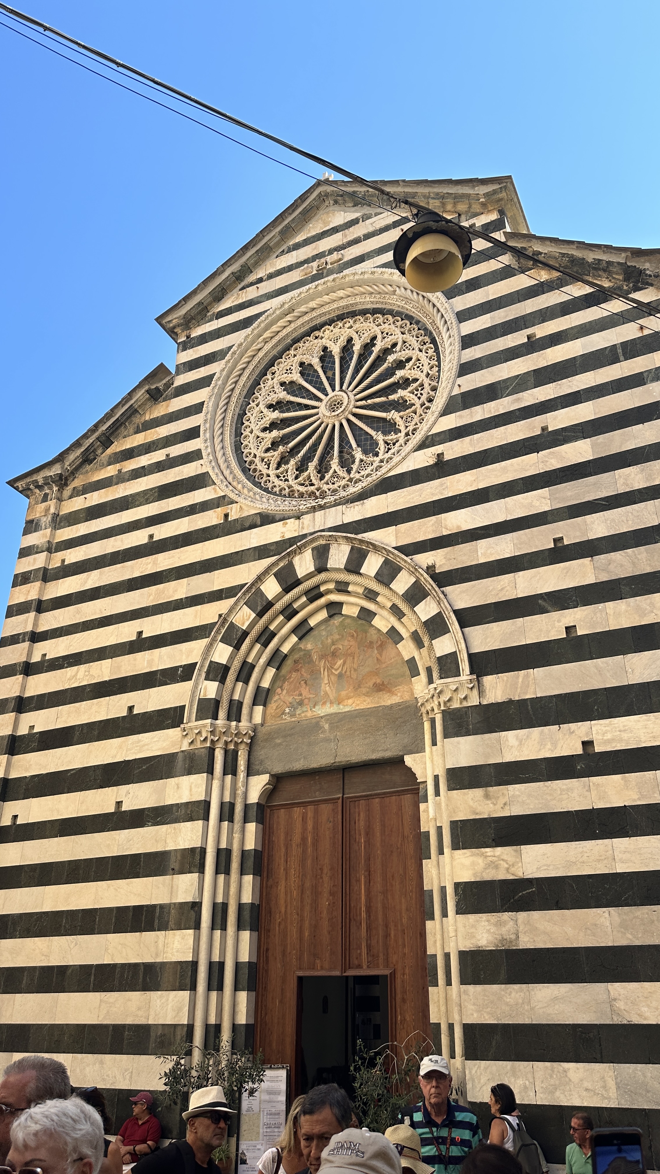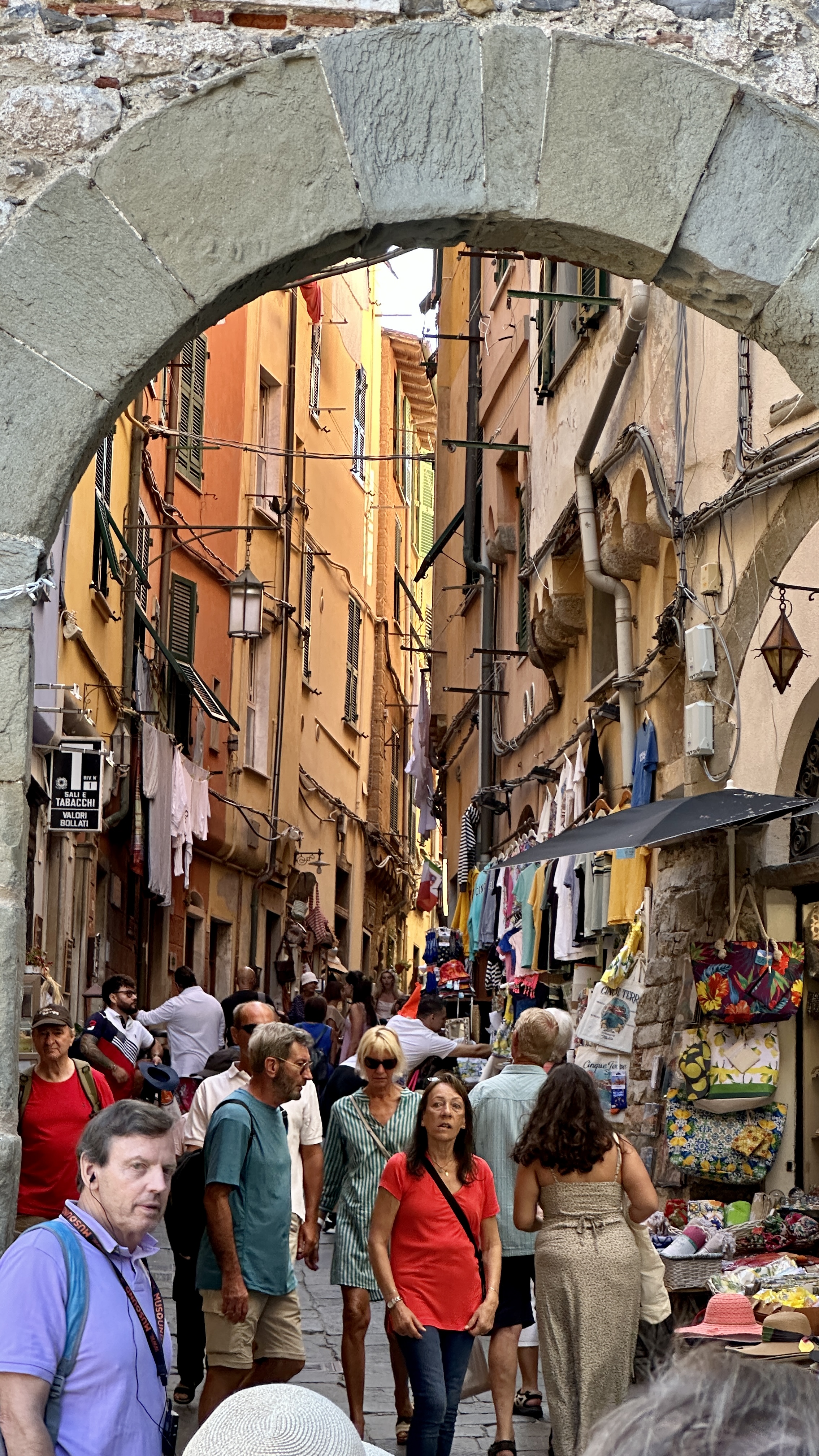 The sea and the mountains leave limited available living space in Portovenere, so one can live in a very narrow, tall flat with five or six stories, with only one room per story/floor! Some wider buildings might have two rooms per story, and some flats might go horizontally instead of vertically, depending on the layout of the land. Furniture cannot be moved into or out of the vertical buildings, in particular. It has to go through a window. If a person dies in such a building, the coffin cannot pass through anything except a window. By building these residences vertically, narrowly, attached one to the next, a wall surrounding the city was formed, which was intended to protect the port and the city from pirates, for example. We saw a charming St. Peter’s Church, perched on a rocky shoal, that is used only for weddings. People come from around the world to marry at this Church.