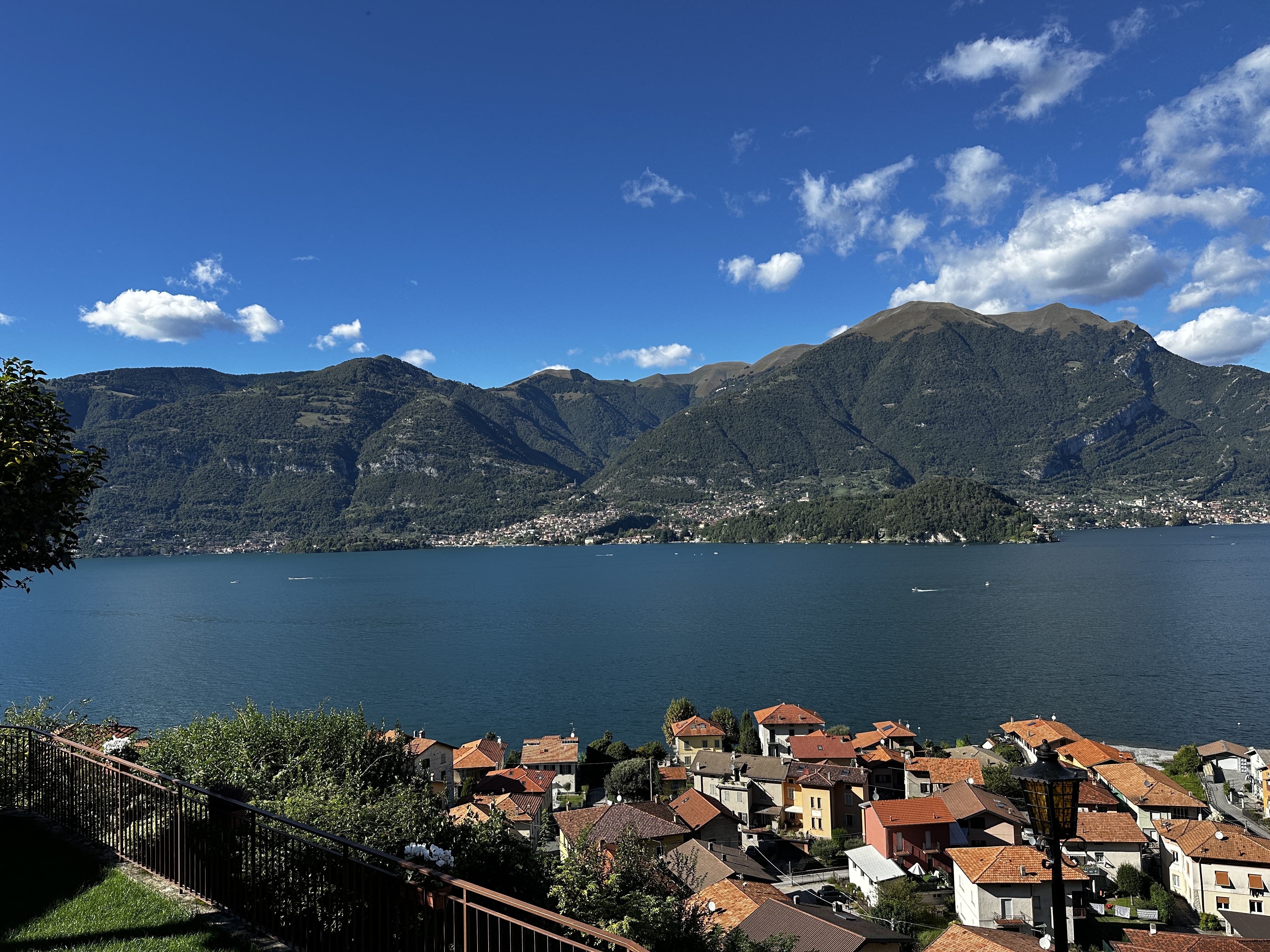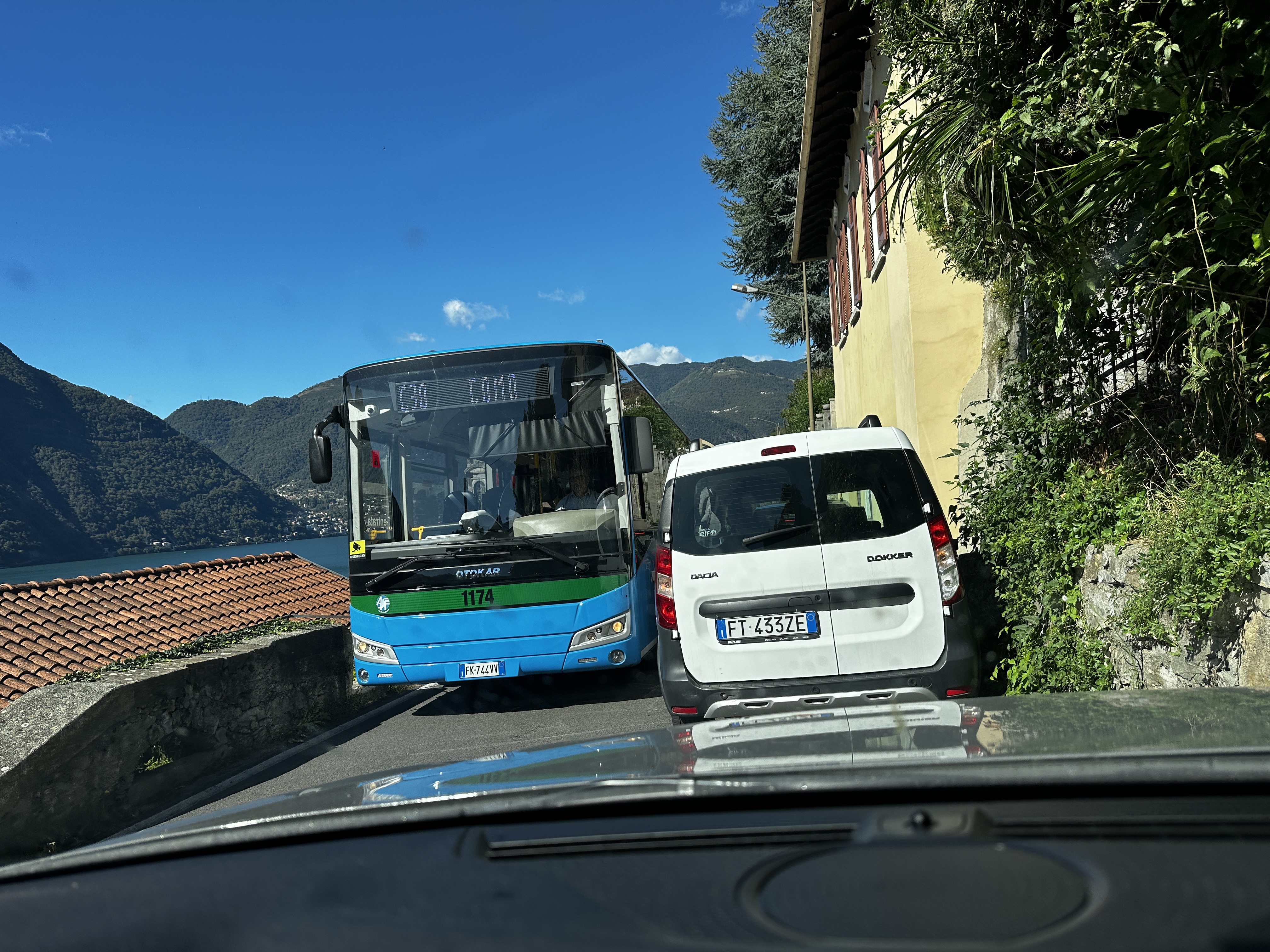 The drive to Como allowed for more and closer views of the snow-capped Alps. When we reached Como, the main town on Lago di Como, we embarked on one of the scariest roads to nearby Lezzeno to find our B&B. The road was extremely narrow, with lots of tight turns with the mountainside on one side of our car and the Lake on the other. Much of the road was perhaps roomy enough for one car, and yet…buses, trucks, motorcycles, bicycles, pedestrians expected to share this road, coming the opposite way. Because one could not see what was on the other side of a curve, vehicles coming toward us from the other direction made for some scary moments, indeed! Dad typically is not frazzled in most driving situations. Driving through and across the Dolomites was tricky, yet Dad was never rattled. Driving up the mountain to our B&B during the daytime was also tricky, and yet, Dad never flinched as long as there was still adequate daylight to guide our way. But THIS?!?! THIS was spooky and DANGEROUS!