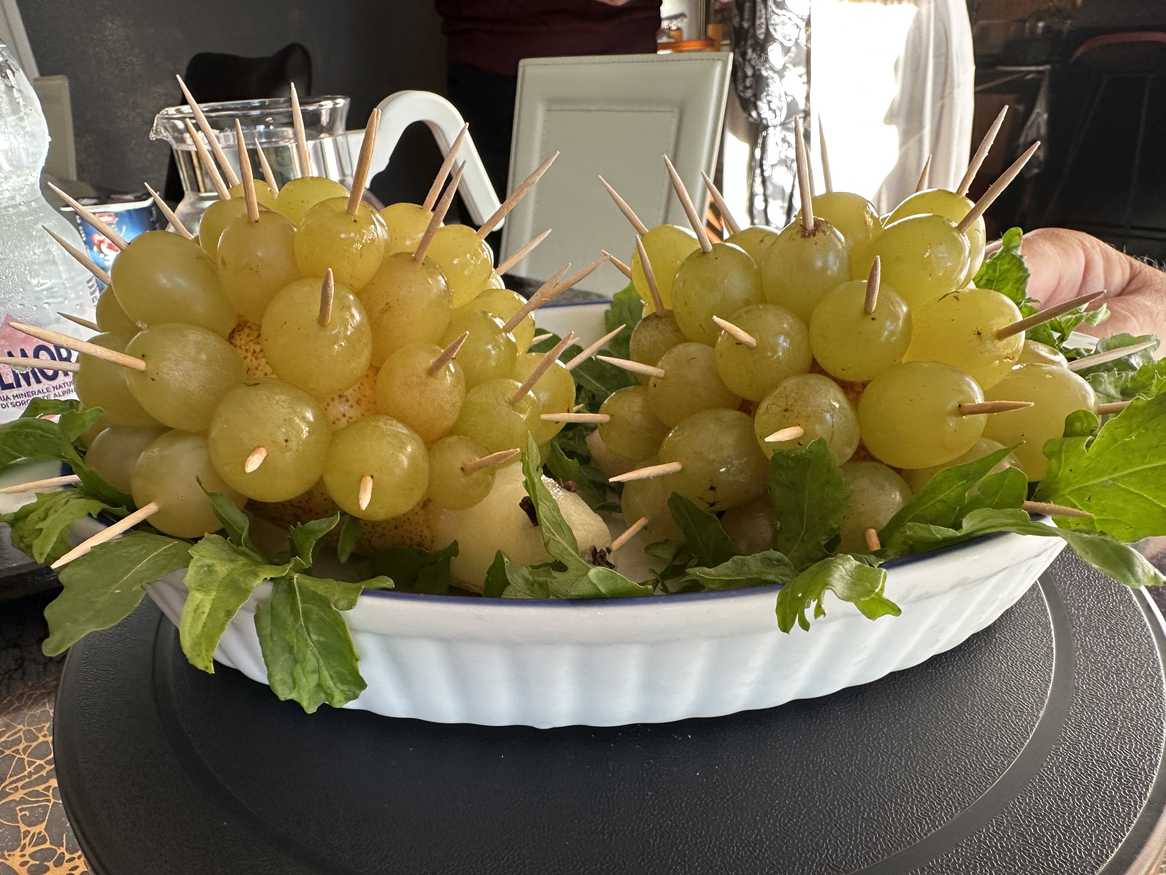 This morning, we rose for breakfast as we have these past six days in Montabone. Francesco and Maria Angela were as gracious as always, smiling, greeting us to begin our day together for this meal. Once again, we were served more than we could possibly ever consume, and everything was delicious! Because it was our last day at this wonderful B&B, we needed to finish some of the items we had only eaten throughout the week. Thus, we had slightly crisped polenta with Gorgonzola and porcini mushrooms, a Sardinian dish that shepherds would bring with them to sustain them throughout their workday guarding their sheep (a crispy phyllo dough pastry with melted pecorino cheese on top—this was not one of the “leftovers”), crudités, grapes on toothpicks inserted into a pear, with the long, thin part of the pair (the stem end) peeled and decorated with cloves for eyes (the creation was made to look like a prickly porcupine—this, too, was new for today’s meal), the typical red orange juice, lazy Susan with yogurts, water, chocolate milk,…., homemade crostata that Francesco had made for us this week, leftover Sardinian ladyfingers from last night, and so on, and so on. There are not enough words to express the quality, creativity, and concern that each of our multi-plate breakfasts have demonstrated to us this week! These hosts went far above and beyond with the quality of service and hospitality they have provided us at this wonderful B&B! We shared more family photos with one another in an effort to get to know each other even better if we could.