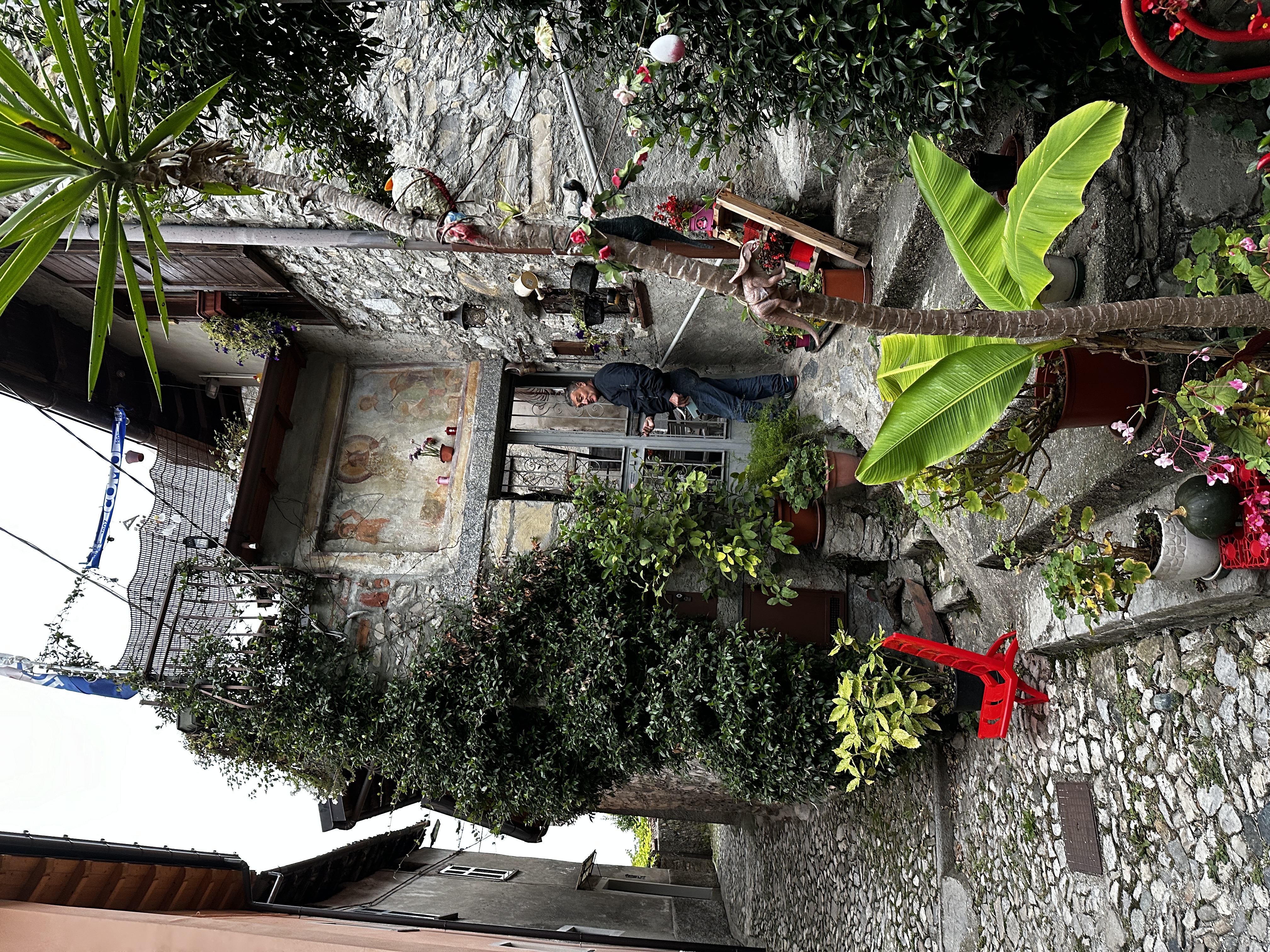 On my walk, I first came across Paolo (Monica’s husband), our Host. We discussed traffic, parking, teeny-tiny bats that fly back and forth at night from our roof to the dark forest adjacent to us, the “yellow” snails that never used to be here until they were likely “brought in by the Americans when they introduced the potato to Italy,” to the fender bender he had with another mountain Local yesterday (“she has a reputation of driving a little fast, perhaps she was texting, or…”. He approached the curve coming up the mountain and activated his brakes, she was coming down and around the curve, and did not brake…but the damage was minor, and no one got hurt”), to Mussolini, to the views just outside our B&B, which he believed are the BEST views of Lake Como, to the age of this community, dating back to 900s A.D., to Villas and how originally people preferred to build as high up the mountain as possible in order to avoid unwanted visitors to anything close to shore; now, however, people are preferring to build as close to the water as possible, believing that those houses/villas communicate more prestige, to the level of the water in Lake Como (it really does not rise because it has no tides. Any excess runoff flows toward Como, so the houses do not flood), to the history of this community dating back to Roman occupation for quite some time, to the Strada Regia (Royal Road/Street) that is the narrow path on which we drive today (much of it, anyway) that once connected travel between Como and Bellagio, to Jewish escapees from the Nazis under Hitler’s rule and the role that some Local boat people ferried them across the Lake to the mountain range opposite us, behind which is Switzerland/freedom, and so on. I enjoyed talking to Paolo, and I hope that he enjoyed the conversation, too.