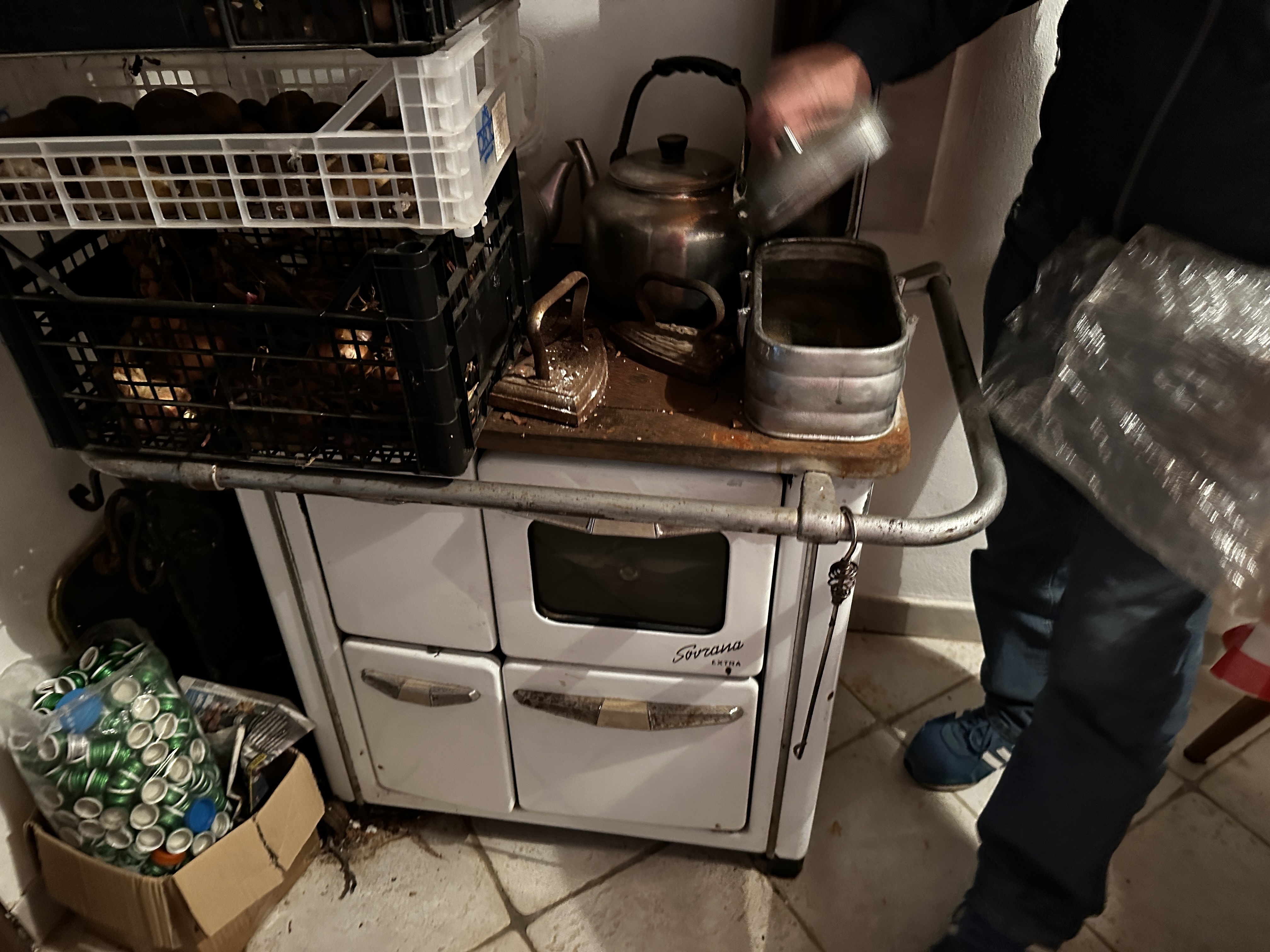 I climbed up a set of concrete “steps” adjacent to our B&B, along a very narrow walkway between our house and the structure next door. I went through uneven cobblestone/dirt/grass terrain, into a concrete arched entryway, and along a very dark passageway with bikes, odds and ends, “caves” on either side of me, and I must admit, I turned on the flashlight on my iPhone to calm my what-if imagination that was beginning to run wild. On the other side was a really charming little outdoor garden, with a small red table and chairs, toy dinosaurs and parrots on vines and along the concrete steps on the left side, and some old, old concrete houses that I was not sure were still inhabited UNTIL—I heard voices coming from somewhere up ahead and came upon an older man sitting in front of one of these old, old buildings on a concrete bench. We struck up a conversation, which focused primarily on the beauty of this old neighborhood, how he was the one who had created that small public piazza (the red table and chairs/dinosaurs, and so on) for anyone to stop by and drink an aperitif, or rest, or enjoy the scenery, and how the piazza was actually in front of the house his grandfather had inhabited many years ago. He explained that he lived in a house just above his grandfather’s. He explained that way back when, when his grandfather was living there, the Rosary would be recited in May of every year. People would gather in this space, now his “piazza”, to join in praying the Rosary. More recently, however, the practice has been discontinued. He invited me to sit for awhile, asked me if I would like him to make me some tea, and when I gently declined his hospitality, he wanted to show me the fresco of the Madonna and two saints (he did not know who the saints were, however. He said that he would try to find out) that was painted above his grandfather’s house door about 100-150 years ago. He showed me the Corte (courtyard) between his grandfather’s house and his, with several tables, where, he explained they cook dinners and serve them to their friends/guests in the summertime. Gianni was eager to show me the interior of his grandfather’s house next. There, he stored some potatoes, apples for ripening, and other fruits/vegetables that he collected from his garden. There is an old, old stove there that his grandfather used to use, some old paraphernalia, such as old irons, coffee grinders, and so on, rom his grandfather’s time. Lining the wall was beer and other beverages to serve his friends. He asked repeatedly if I would like anything. He offered me an unripened green apple from his tree, which I graciously accepted as a “memento” from my “tour”, or perhaps my trip to Italy. He was quite proud of his toy dinosaurs lining his property and wanted me to photograph them. They are there as a point of interest for children who might walk by and want to play with one or more of these. He showed me his garden, his lemon tree, and even the bananas growing on his banana tree! We talked about the little Church another 15 minutes uphill, and how Mass is still said there about two or three times per year.