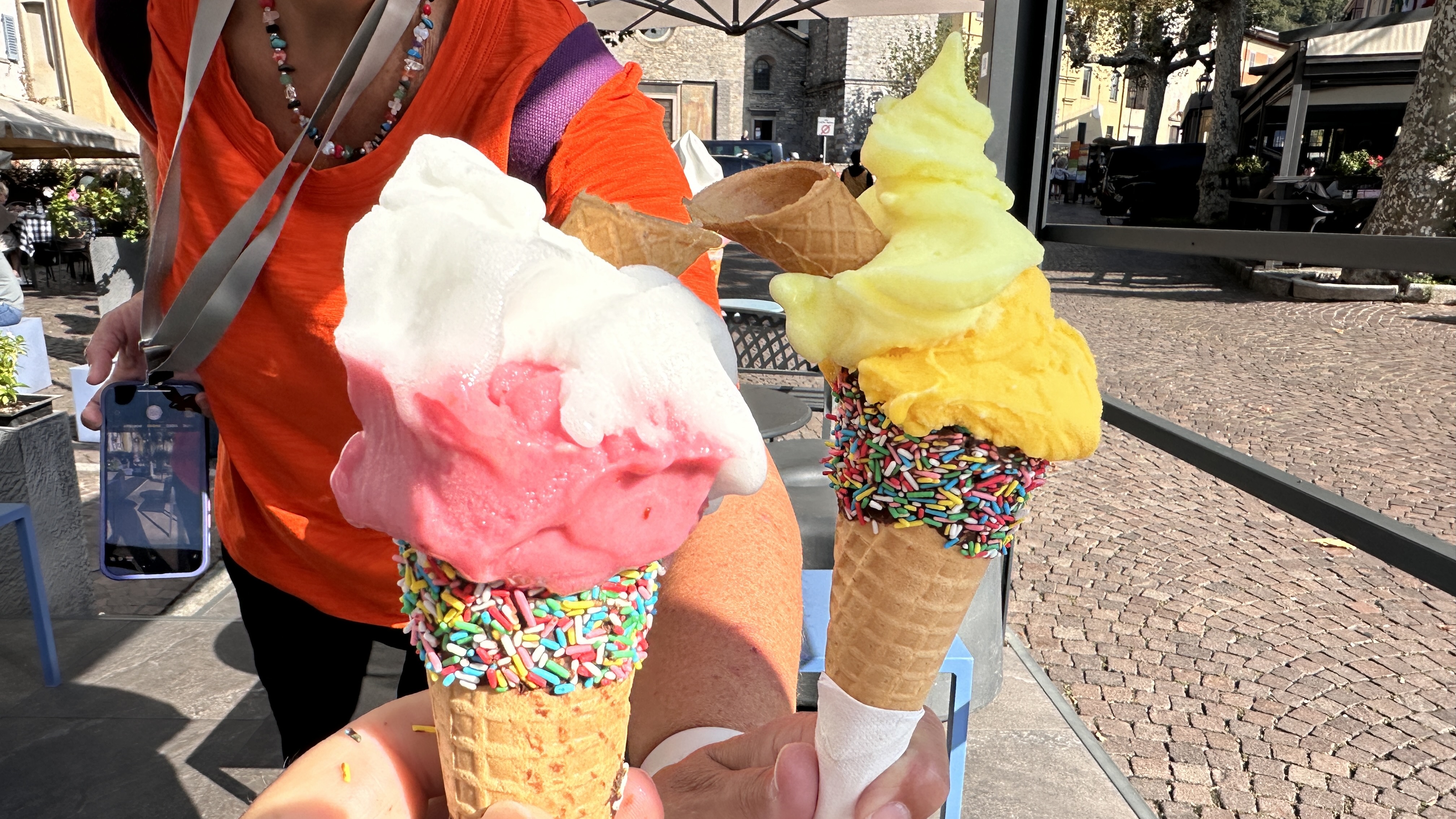 Getting around Varenna itself was relatively easy, unless…one wanted to go down as close as possible to the shore to have lunch at one of those romantic little restaurants with outstanding views! So, how badly does one want that food? That will determine whether or not one will brave walking down a very steep damp cobblestone path between two buildings with intermittent railings to keep one upright at all times. We chanced it, took our time, hung on to whatever we could, and we made it to the shore for a most delightful lunch. Lunch was outdoors, of course, with seating overlooking Lake Como, and we shared fried pumpkin flowers, while Dad had pasta carbonara, and I had eggplant parmigiana. We saved dessert for one of those inviting gelato places we passed when we first walked onto the piazza. So, how badly did we want the gelato? And…did we really need to get back to the parking garage so soon? Because…whatever goes down now has to come back up. We schlepped it up a steep narrow cobblestone path to street level. The gelato was awesome! The flavors were so intense! The gelato was made in house, and they do not use any artificial anything in that gelato. Dad had lemon and raspberry, and I had limoncello and something starting with an m…j…a that tasted like mango or maybe passion fruit. Delicious!