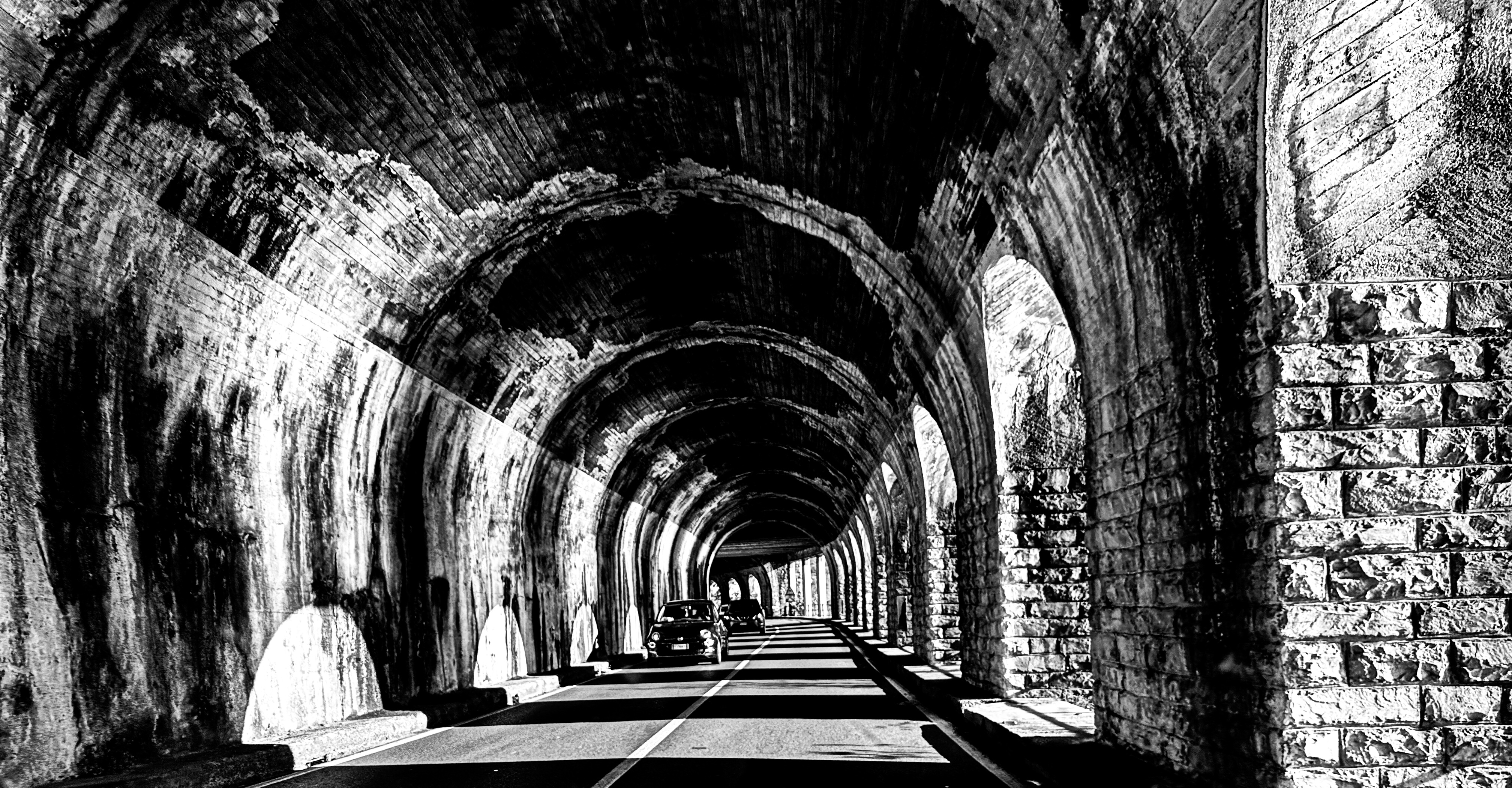 Because there are big, huge mountains around Lake Como, traffic (and even bicyclists—because, where else would they go?) must go through tunnels of varying lengths. On this stretch from Lecco to Varenna, however, we found interesting tunnels that looked very different from the typical that we had been seeing. Some had open spaces/sides, some had heavy boulder walls, some showed junctures/darker rings around the inner archways, making the tunnel look like a folding accordion almost. Really, really cool!