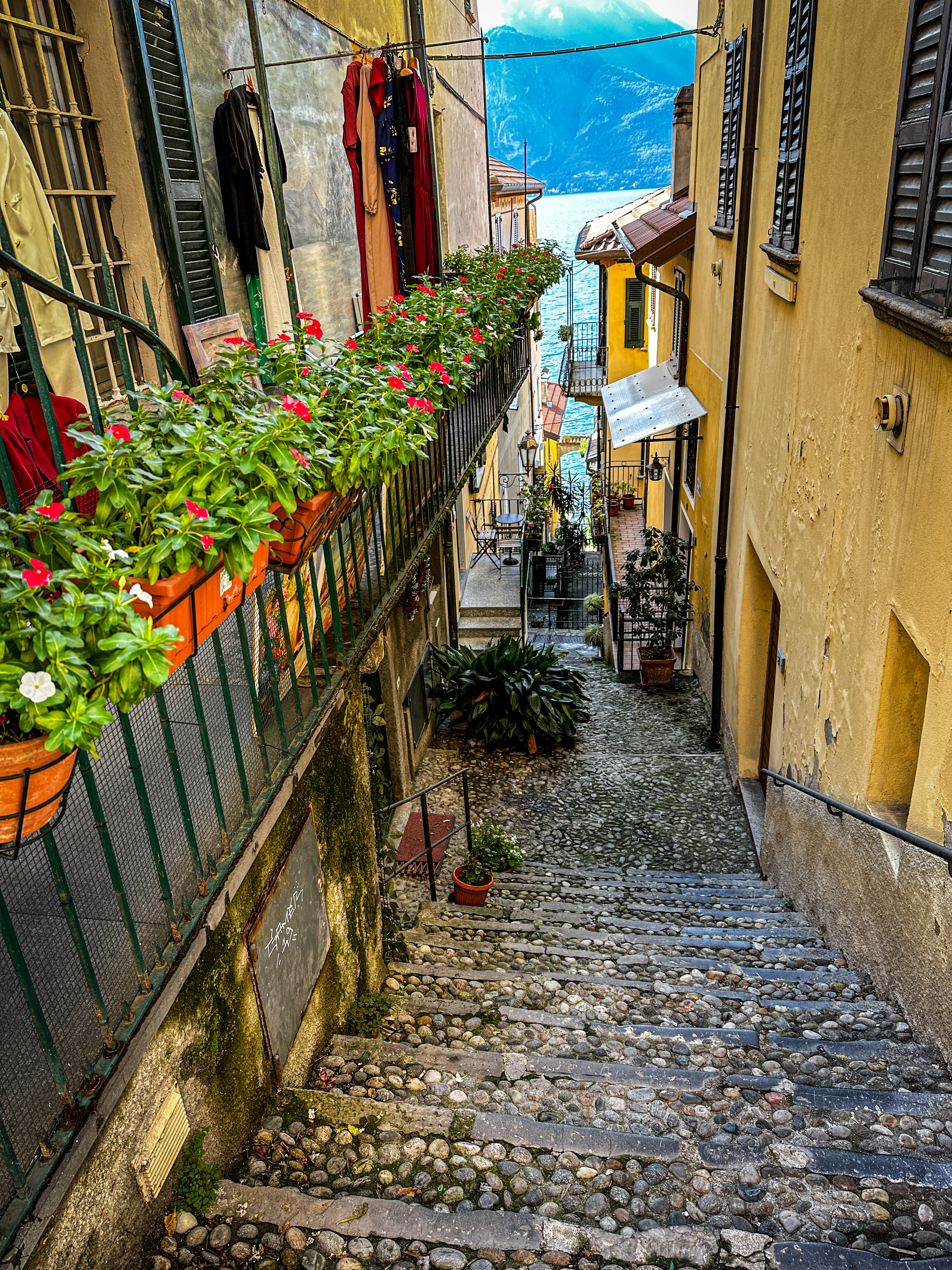 We had been told that most villas around Lake Como were closer to the shore, and our walk around that shoreline after lunch revealed some of the massive and colorful properties, even a monastery, with beautiful, lush gardens. Those villas don’t look like villas I’d imagined. Rather, they look like big houses, or even hotels, with lots of windows/rooms. Some of the villas, I think, are used as B&Bs, because we saw lock boxes higher up in town, but I’m not sure. Anyway, the potted flowers around the properties at the shoreline and even a little higher up, the giant agave plants, the old trees, the Cypress trees on some of those properties…all of those just made Varenna POP!