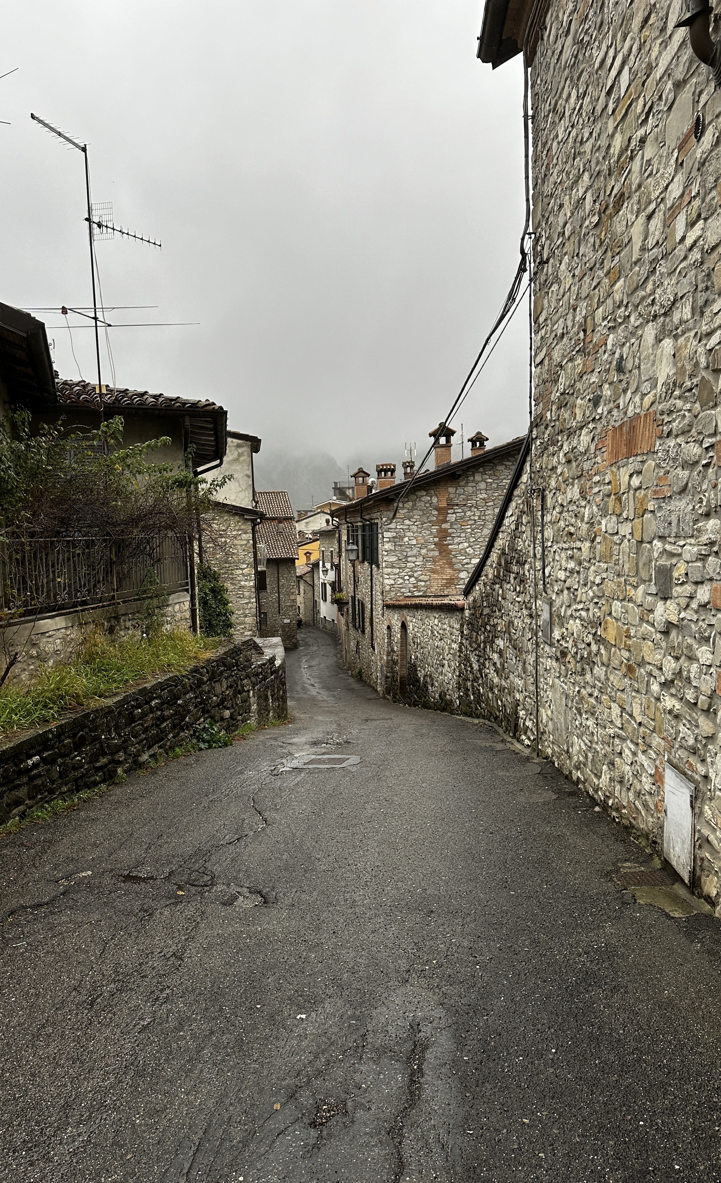 It had rained overnight, and the ground was wet when we left our B&B in Lezzeno this morning. The rain and/or clouds followed us as we drove about three hours from Lezzeno to our next stop, Bobbio in the Emilia-Romagna region of Italy.. By the time we reached the outskirts of Bobbio, the rain was steadily more than just a drizzle. In addition to the rain, the wind was a bit stronger than it has so far this trip to Italy. The temp was only in the 50s. All together, this was a raw, wet, chilly day! But…it is what it is, and we are grateful for what we have; so, we ventured on to the Relais Sant’Ambrogio, our stay for the next two nights.