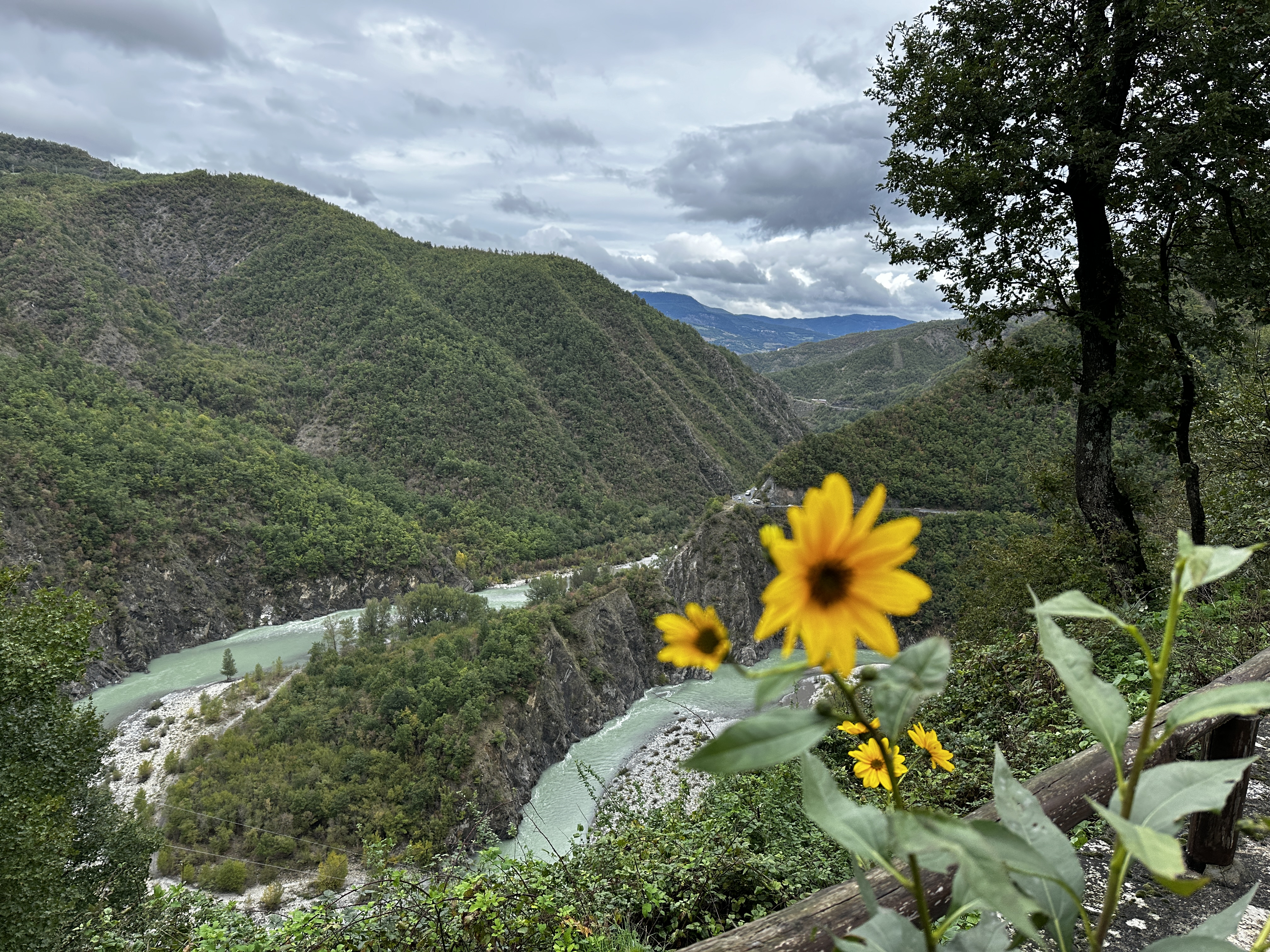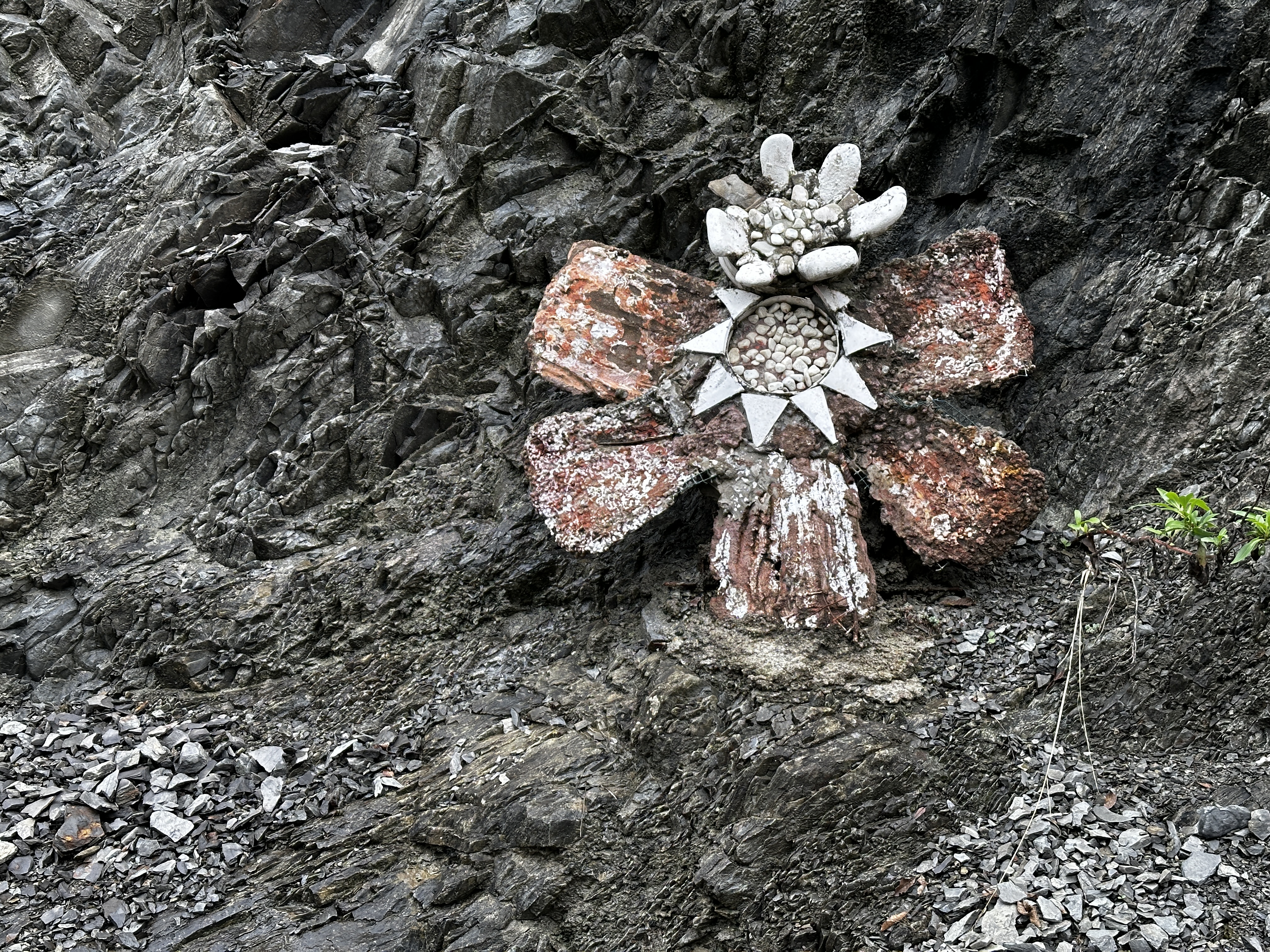 Our hosts recommended that we go to Brugnello because of the exquisite scenery! More speciffically, the Trebbia River, which snakes around the Bobbio area, creates a horseshoe shape as it winds about in gravelly, rocky, mountainous terrain. It was reminiscent to me of the Colorado River in Page, AZ, a spot called Horseshoe Bend! Whereas when I viewed Horseshoe Bend the water was a deep olive green, this Trebbia River water was a light blue/white/ice-colored waterway, especially as it raced around the rocks and graced the shoes of light-colored gravelly terrain. Just.beautiful! AND…the town of Brugnelllo itself is gorgeous! It looks as if one has stepped into a fable! The flowers against the dark cobble-stone are beautiful, and even the cobblestone walkways are formed into mosaic-like floral designs. In fact, as we drove the squirrelly curly-queue mountainside to get to Brugnello, there were metal whimsical artistic structures planted into the rocky mountainside. Our host explained that all of this was done by a man named Pinpin Mazzotti, who lived in Brugnello, had retired, and did all of this artwork as a hobby.