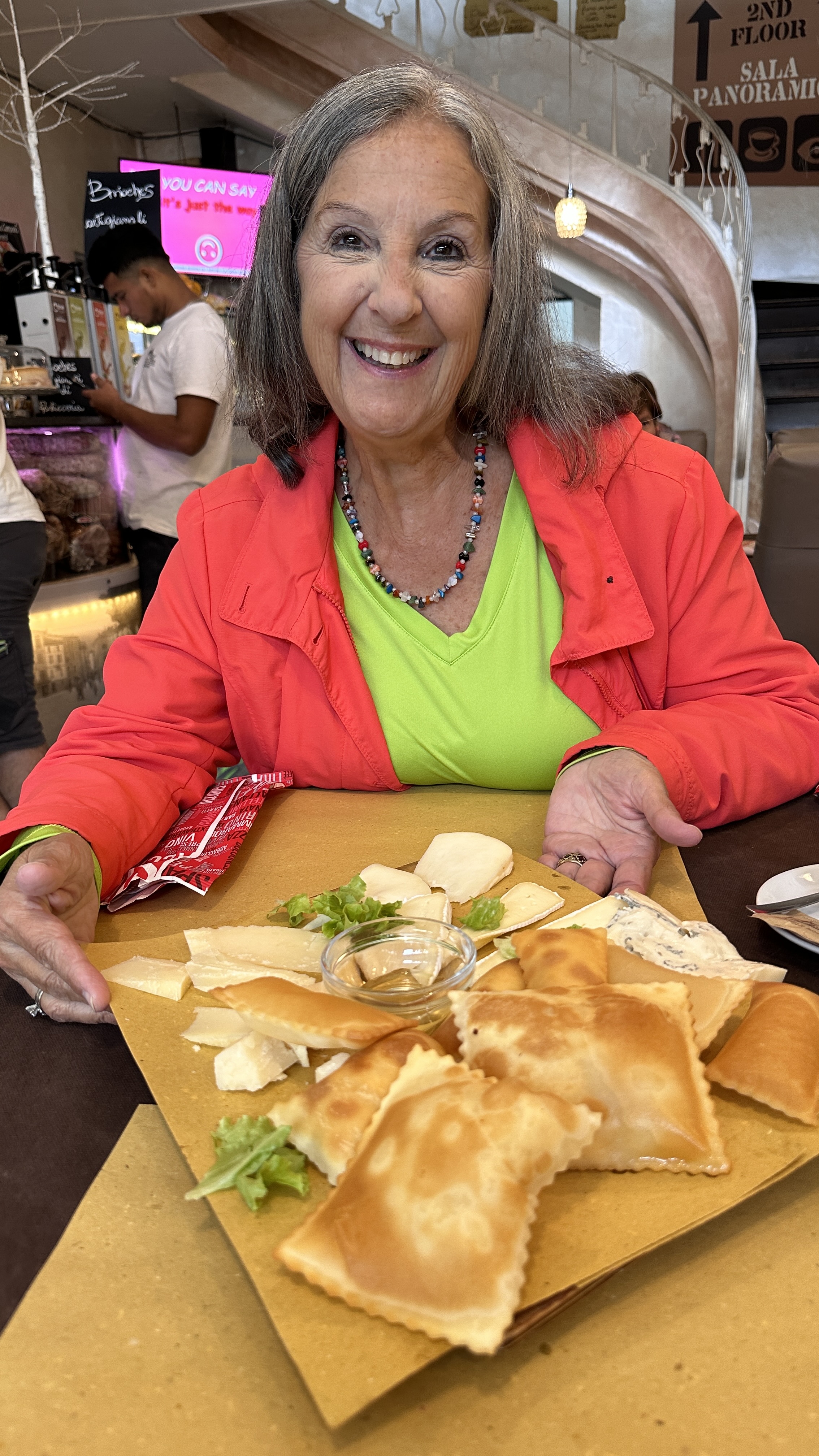 October 4, 2024–. Bobbio! Because now we are getting close to my ancestral surroundings, and because our stay in the area will be relatively short to fit everything in, I am going to keep these next few blog posts pretty brief. Today, it was a cloudy-just-a-little-sun-type of day—but, unlike yesterday, it was not raining. After a lovely breakfast at our Farmhouse B&B, we went to town to visit the Santuario Basilica Madonna dell’Aiuto (Madonna of Help); tasted Gnocco Fratto with cheeses in a piazza little restaurant; visited in Duomo di Bobbio, also dedicated to Mary and the Annunciation; visited the small mountaintop nearby town oof Brugnello; visited the Basilica of San Colombanus, and ended the day with an exquisite home-cooked several-plate dinner by our hosts at our B&B.