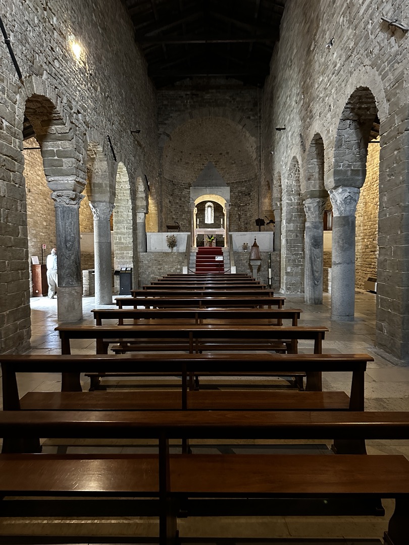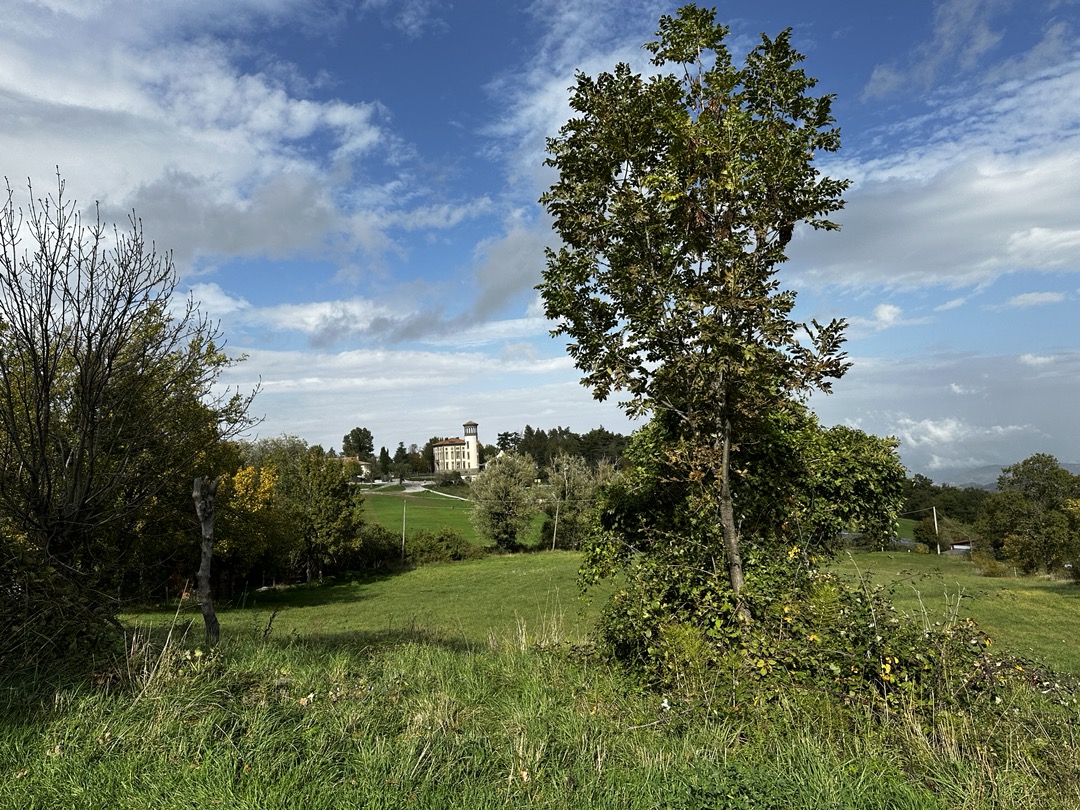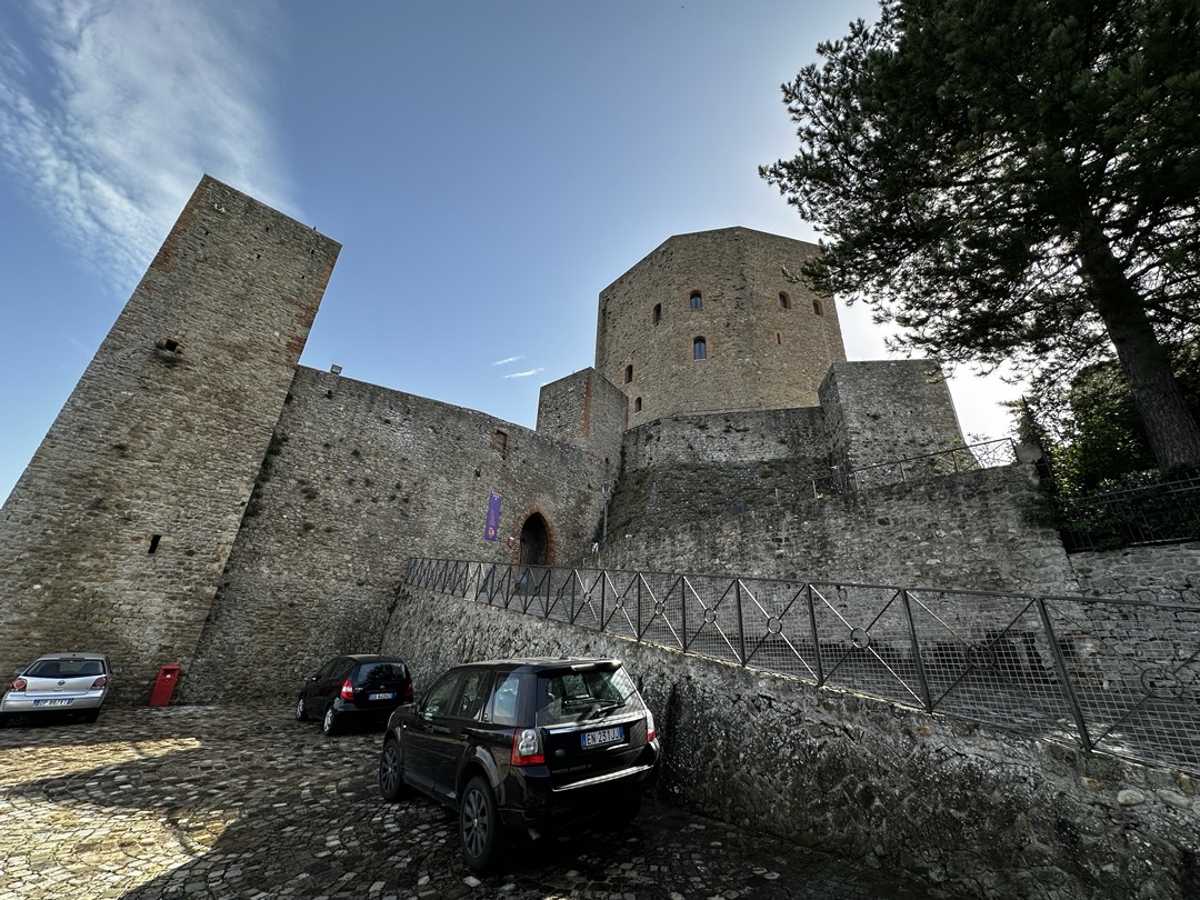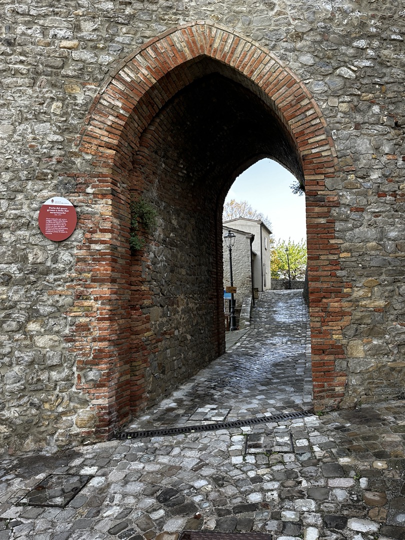 17 October 2024–Looking for Sunshine—or, at least, no rain: Raining today—again! :). So…we drove to where there would be no rain. We went to the Montefiore Conca, San Leo, and Rimini, all still in Emilia-Romagna, although in the Rimini province (not Modena). We could not go to Rimini without checking out the beach, so we quickly stopped at the Spiaggia Marina Centro, Rimini. The Montefiore Conca was the summer home of the Malatesta Family, a fort built to defend power and property, especially between the Malatestas and the Montefeltros during thee 1300-1500. It is huge and perched on a mountain from which the green landscape and Apennine peaks/hills are impressive. Chestnut festivals are held there every Sunday in October because chestnuts somehow grow abundantly in the surrounding woods.. So do olive trees! I guess that typically, olive trees and chestnuts don’t grow in the same environment; therefore, scientists are studying how this could be. San Leo is also located in the region of Emilia-Romagna and. Not all that far away from Bologna (80+miles). It is also in the province of Rimini. (Conca is about 70+ miles from Bologna, and it is also in the province of Rimini). San Leo is a community surrounding a fortified castle that is literally on a rocky peak, at the tip of a steep rocky cliff in the Apennine Mountains. It borders the Marche and Emilia-Romagna regions, as does the Montefiore Conca. In the Middle Ages, around the 1300-1500s, this was contested territory between the Malatestas and the Montefeltros. The San Leo castle was an important get-away site for Federico da Montefeltros and his wife, Battista Sforza, The town has a Cathedral dedicated to Mary. The Church’s architectural style reveals its Roman origins (arches, stone, etc.). The town of San Leo is quaint, charming, historic, and old. The views from the vantage point of this castle are spectacular when the skies are clear and hauntingly lovely, even as the fog occasionally sets and repositions among the mountain peaks. While in San Leo, we had a coffee and split strozzaprete (hand made with yarn needles) in a veggie sauce/with veggie chunks. From San Leo, it was a short drive into Rimini itself just to catch a glimpse of one of the beaches along the Adriatic coast. We stopped at the Spiaggia Marina Centro, which was now officially closed, with the sands beamed between the point of high tide and thee sandy beach areas on shore. The sand is a definite tan-gold color, with specks of what appears to be dried salt. A worker at a local restaurant told me that although this beach was now closed, other beaches along the Rimini coastline, those by the hotels, restaurants, and so on, were still open. We stopped for a bathroom break, which meant buying a coffee and small snack to justify our use of the toilet in the restaurant. We shared a Emilia-Romagna classic that can be filled with anything one wishes. It is called a Prada. There are only water, flour, and shortening in a Prada—no eggs, no sugar, or anything else so that it could be savory or turned into a sweet. I liken the Prada to a wrap, or a crisp flour tortilla. Ours was filled with Nutella (of course) and sprinkled with powdered sugar. Dinner was at Isadoro’s, near to our B&B. Dad had chicken and fries, and I had a boiled potato and Brie pizza.