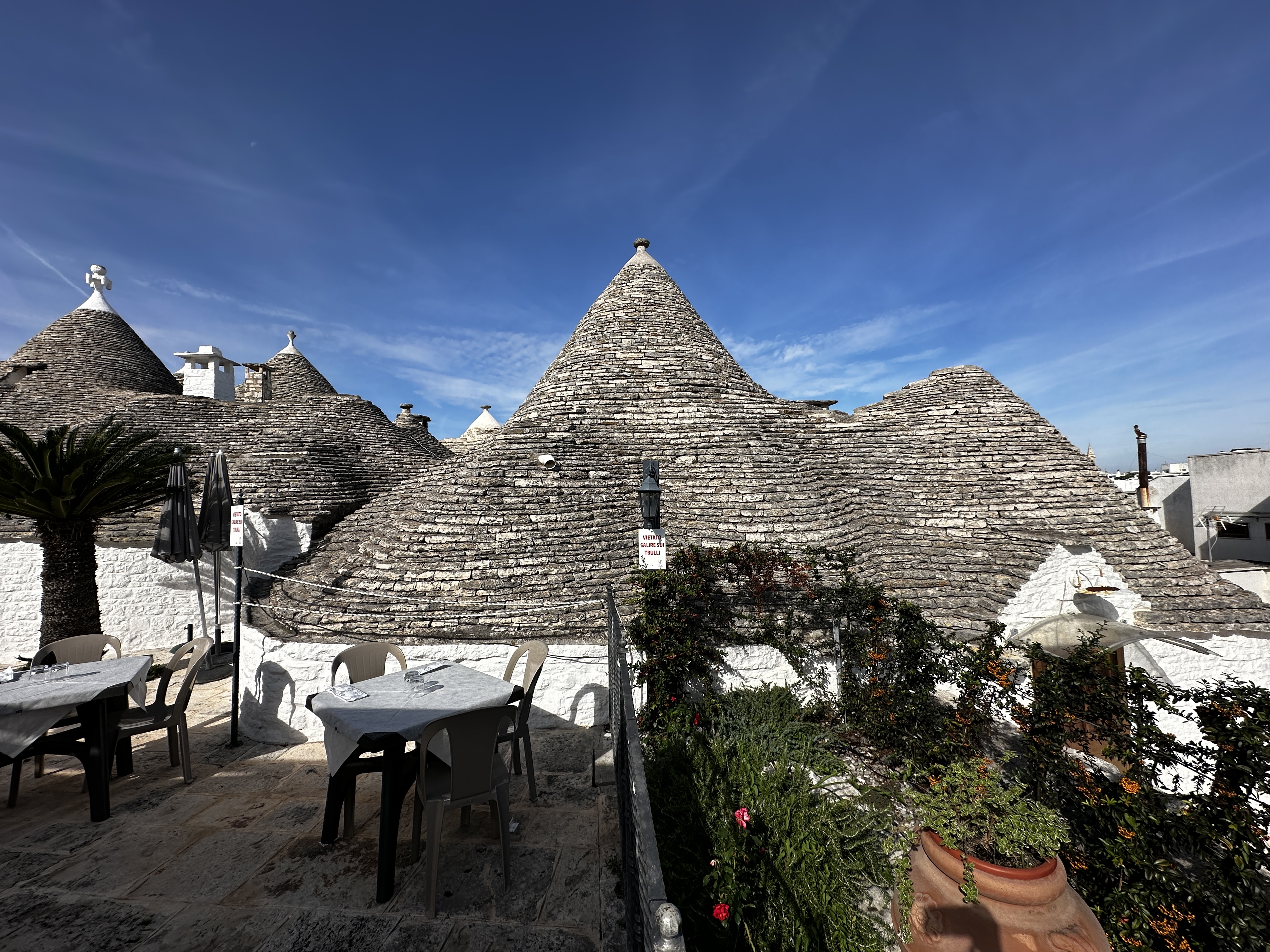 24 October 2024–Dad says he is working on only a few more cylinders. Good sign! Got him to go for breakfast a short distance from our Trollope, trying to a void making him walk up and down sloping walkways and getting unnecessarily winded. He is still weak. Dad ate some fruit—good! Staying away from grease, buttery stuff…. I had my favorite: a fresh cornetto/croissant! The kind waiter opened a cordoned area at my request so that I (and other visitors) could take some panoramic photos of the trulli in Alberobello nearby. They are so very pretty to see! Oh, by the way, today is SUNNy and warm! I LOVE waking up to this weather! We drove to Ostuni in Puglia. On the way, as we approached Ostuni, we saw some HUGE olive trees! My cousin, Alfredo, had told me about a place nearby that had olive trees that were 1000+ years old! These must be what he meant! WOW! Their trunks were lumpy, twisted, thickened, nubby, arthritic-looking, cavernous….These trees are still producing olives! Alfredo told me that recently a virus/disease infected some of the old, old trees, and they had to be cut down. What a shame, and what a loss! BUT—fortunately, many old trees remain! Ostuni is known as The White City (But, actually, Alberobello is white, too). Ostuni is in the province of Brindisi, sill in the region of Puglia. It is a White City because it is located uphill, and the buildings are white. I walked up steep uphill slopes and large white stairways to get to the top of the hill, white all around me. I walked on steps that had blue printed lettering, spellling out verses or famous sayings from prominent people, such as St.-Exupery, Aristotle, Ann Frank,….I saw houses, perhaps some vacation homes, but generally, dwellings all the way up the slope and top of the hill. I saw a church that seems to have been converted to an exhibition hall, today, the banners at the front of that building announced a Mexican art exhibition. But…no historic center like others I had seen. I asked two locals where the historic part might be. One said that all of this was historic. Two others said that I had to go downhill to a large piazza with an obelisk and then climb uphill on the other side from there. Uggh! But I did it! Just as the Locals had told me, a very old, tall column of St. Oronzo, the patron saint of Ostuni, stood at the center of the piazza. There were some wonderful panoramic views of the olive groves, a beautiful church dome, some farms below, but I did not see much else that I thought I should have been seeing. There were shops in the piazza, cafes, restaurants, and so on, butt I ventured up to wherever it would lead me. All the way up, I was surrounded by white everything, shops, cafes, restaurants, and so on lining the cobblestone street. Little charming narrow roadways veered off to the sides at times, some decorated in interesting and creative ways. I saw arched walkthroughs, a large concrete, old overhead arched entry way to the section of town above, Of course, I saw a very old Cathedral, dating to perhaps 400 A.D., I’ve read, and several more churches. According to the internet, most things are white in this city because each year everything is painted white to keep the buildings cool during the hot summer months. Toward the top oof the hill, in a little bit of flat land containing a quiet little bar, I did find the blue and green door that the Internet has called, “The most photographed door in Ostuni” or “the Instagram door,” so I took a selfie in front of it. But, actually, I found a second door, similarly painted and covered by a glass storm door of sorts down below toward the Piazza, but a cat was looking at itself in the glass door, so I did not disturb. I walked on. The White City, in my opinion, must also be admired from outside of it, though. Getting a good view and a photo of it was not an easy task because of traffic patterns, narrow, winding roads, and other obstructions. But I walked where I could and captured the White City the best that I could. I walked…because Dad sat in the car during this visit to the White City. He waited while I explored and brought pics back to share with him. He is a little better but not in shape yet to climb the steep slopes. But…progress was made a little bit later at a McDonald stop in Fasano, near Ostuni. He was able to eat a McDouble and an ice cream sundae! My dinner was composed off mini-pucce (a puccia is a commonly-sold small bun that is sliced and fillled with local ingredients. It is sort of like a small round of bread/bun). My pucce were filled with burrata, black olives, eggplant, zucchini, tomato, and whatever vegetable. Of course, they were sliced so that the filling would be sandwiched beneath the two halves of the bread. They were good, and I loved trying something commonly eaten by the Locals! We ate dinner in the piazza at one end of our trullo’s street. It is a lovely piazza at night, with white stone pavement that looks like shiny marble under the lights. There were other streets in Alberobello that we could see that had trulli, not just our own. The distinctive conical roofs of the trulli add charm wherever they are located, in my opinion, both by day and night.