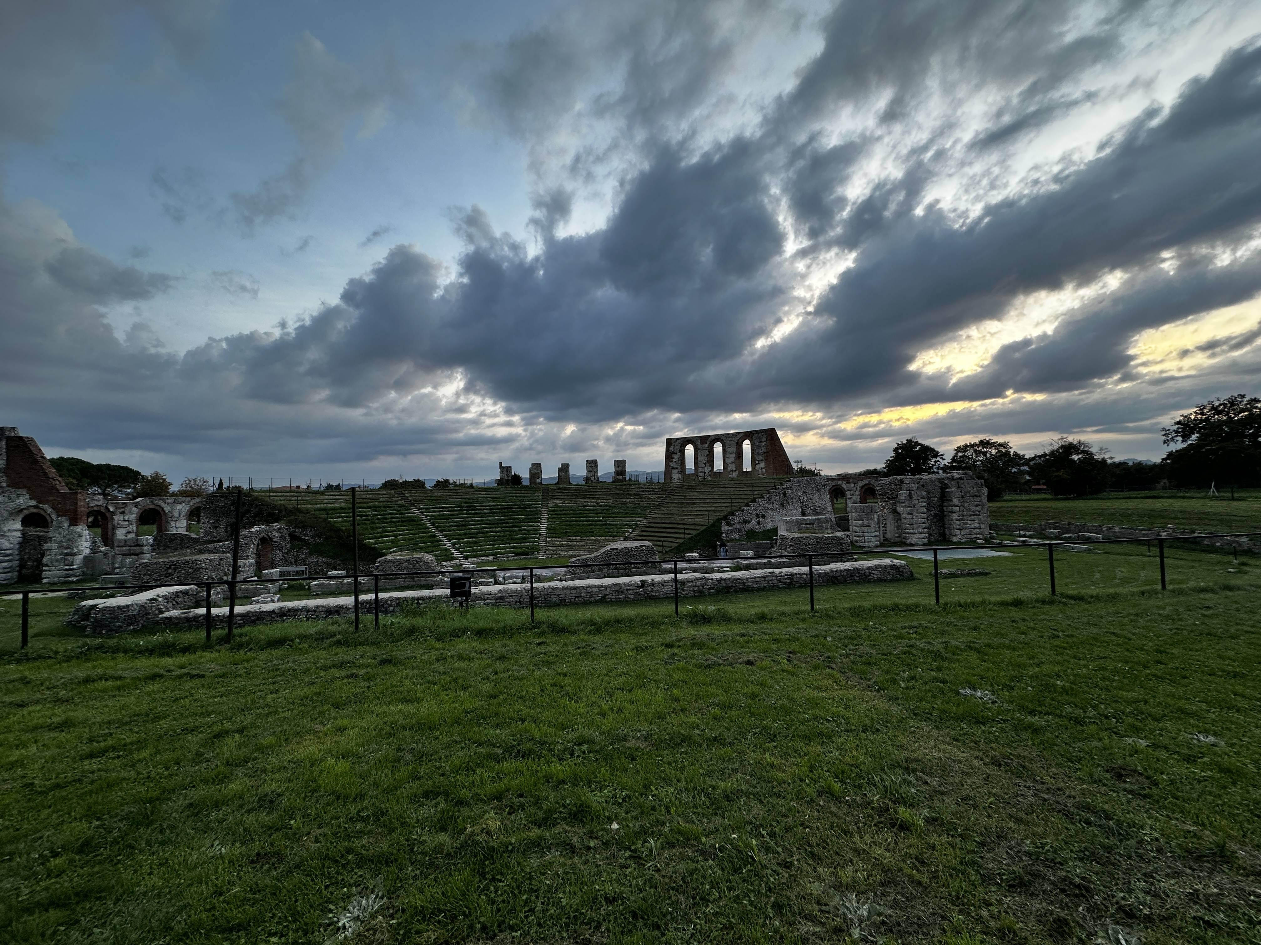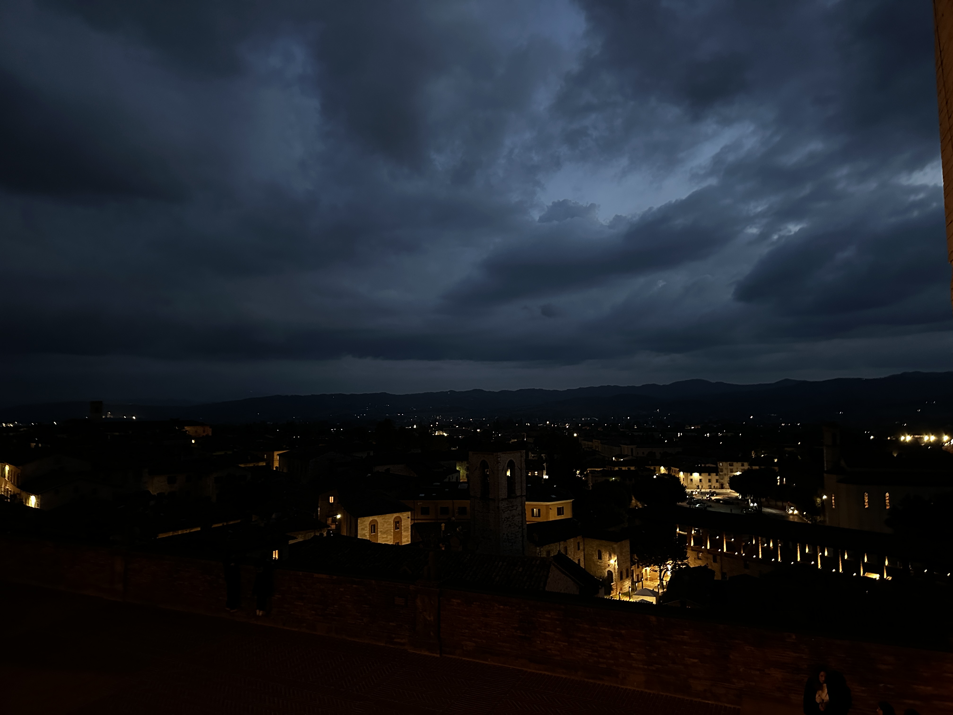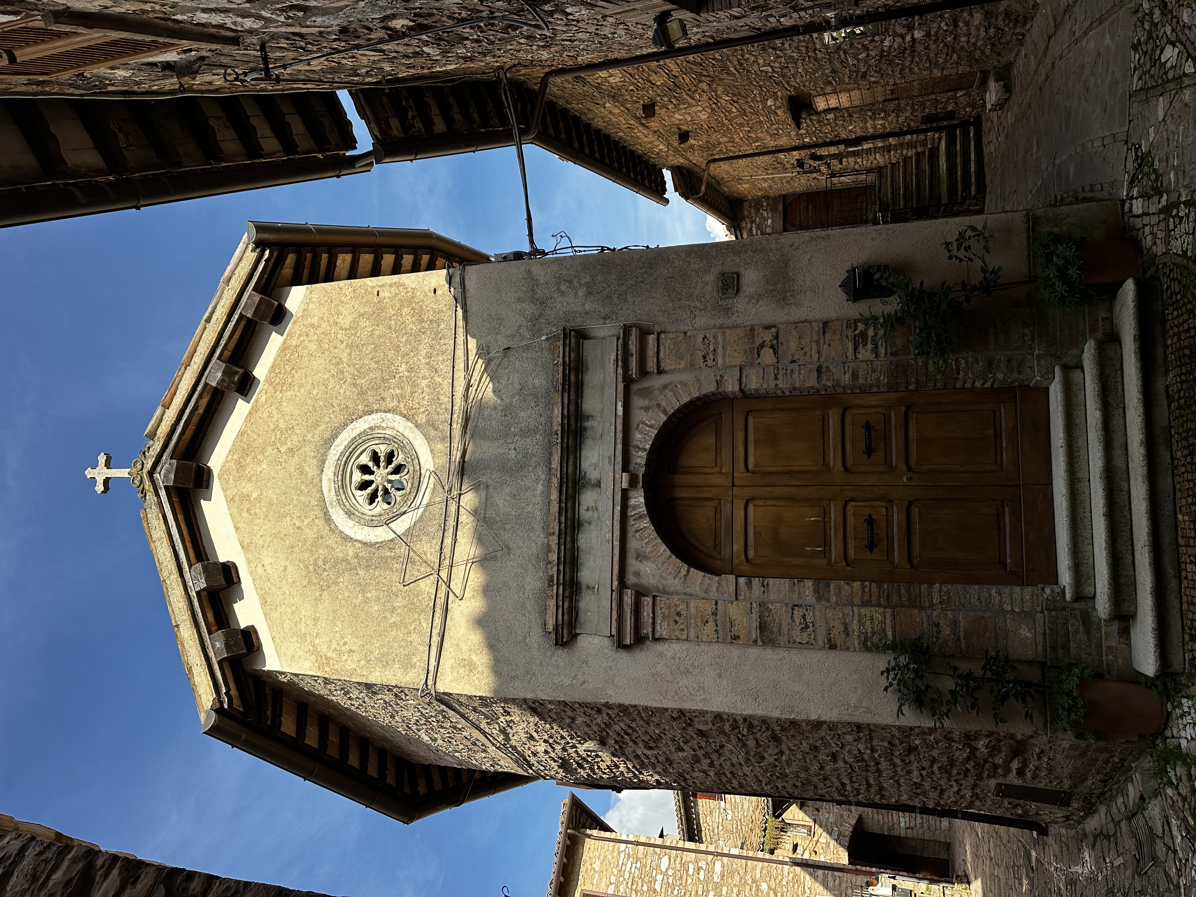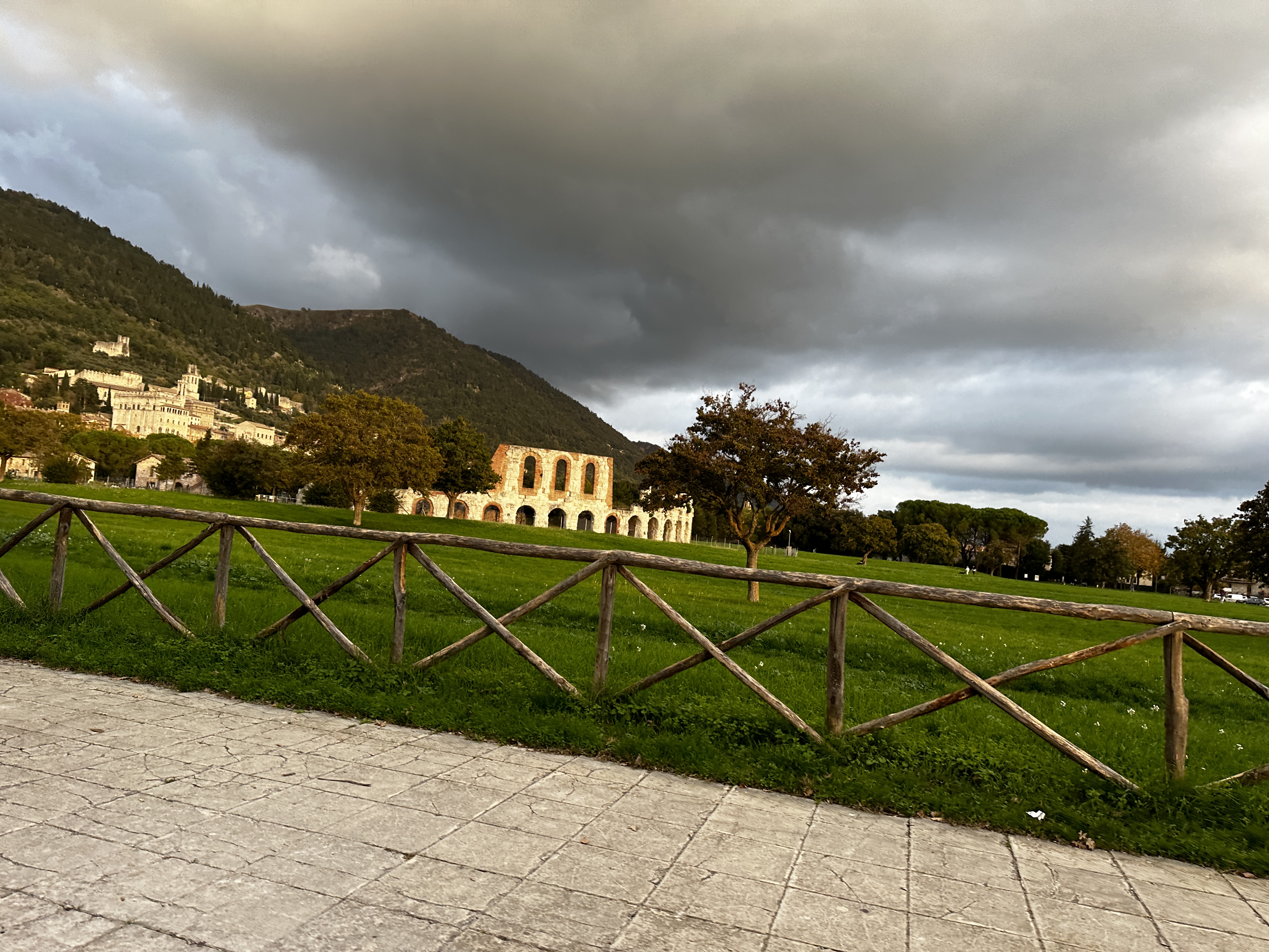 27 October 2024—This was a day of changes. We began with a change in daylight savings time in Italy. We did not expect it until next weekend, thinking that it would happen at the same time around the world, I guess, but, we woke up having gained one entire precious hour! It was laundry day, typically not on Sundays, but yesterday it was needed. Call-the-doc day. Visit Collepino, Perugia, Umbria, Italy, and Gubbio. The day ended with dinner at our B&B and a delightful—always precious—FaceTime visit with our Addison Trutys. I love the recent kind of laundromat in Italy. The washing machines already come loaded with detergent, sanitizers, and whatever else one needs to wash a load of laundry. The wash cycle for the larger machines is around 47 minutes, but the clothes are actually cleaned, one hopes. The dryers can dry a large load in 15-20 minutes! AWESOME! While there, we researched how to visit a doc in Italy as a traveler from the U.S. People here don’t pay for doctor visits because it’s all included in their taxes. For us, the online video chat with a doctor from Rome, as it turned out, who spoke English well, was $24 Euros, that’s about $25-$26! The doc nodded as Dad described symptoms and so on, as if he had heard all of it before. He suspected that Dad has a gastroenteritis of some sort, cause unknown, but it seemed to the doc as “Travelers’ illness.” I guess it’s a “thing” that others have heard about here. Basically, his system is entirely disoriented and discombobulated, and the doc prescribed an antibiotic in addition to whatever he had been able to already purchase from the pharmacy at the pharmacist’s advice. Two a day for five days. Let’s see what happens. Fingers crossed. We traveled to Collepino, a very small and quaint little town near our B&B, nestled in the beautiful Umbrian landscape. It is, of course, medieval, but this one did not require us to climb uphill as much as Spello, for example, to which we initially drove, took a look at the town up a steep hill, and decided to drive away. I think there are about 35 residents in-season in that small town, but the views are fantastic, the weather was lovely, there was both a bar and a restaurant there (btw, a bar is not what one considers a bar in the U.S., serving liquor, primarily. Bars here also serve food such as tagliatelle, charcuterie trays, piada (sort of like a wrap that is warmed up), and panini (hard rolls stuffed with cheese, prosciutto, mortadella, and so on), and the narrow streets and buildings were absolutely charming. Then, we traveled to Gubbio, also in Perugia, Umbria, Italy. Now, this is a much bigger complex, it is medieval, and it is mostly situated uphill, in fact, the Duomo is literally perched at the tip, tip, top of the hill (keep in mind, that hills are often at least 2,000-3,000 feet above sea level, and these are the Apennine Mountains). The first thing one sees when one parks at the bottom of the hill, is the Roman Theater. This is a giant ruin, but pretty well preserved, of a round arena-like Roman theater, just as one would imagine it to be. There was a lovely parco di gioco, or play area, next to the Roman Theater that appeared to have been overseen by a fun-loving adult. Kids ran about and laughed and played games, on the equipment, and even with giant bubbles, challenging each other to keep the bubble growing and “live” until one backed up to a finish line in the grass. This was a really cool area even for people watching alone. Plus, I MISS the sound of children playing/laughing…. It was awesome to hear once again, even though these were not all of YOU! Dad stayed in the car because of the anticipated steep climb. I walked on, trying to convince myself to climb yet another one of these “hills.” I met a lovely older couple along the way who convinced me to climb, that it was well worth it, “e da vedere,” “vale la pena” (it is something to be seen, it is worthwhile). The couple was charming, as in, we wanted to hug each other good-bye after only about five minutes’ conversation. Soul mates? I believe in those…. So, I climbed. I walked through a lovely large courtyard, past an old, medieval-type hospital that was no longer working (I don’t think), and began my climb up to the piazza. By this time, it was starting to get a little dark even though it was not yet 6 P.M. Ugggh on this time change thing now! The lady I had met said I needed to get to the top to be able to enjoy a beautiful view of the surrounding landscape/town before sunset. I walked past a statue of St. Francis of Assisi (keep in mind that he is everywhere, he is the patron saint of Italy, after all). This was St. Francis with a large wolf resting its head on his lap. According to “I Fioretti di San Francesco,” (The Little Flowers of Saint Francis), this was close to where Saint Francis met the vicious wolf. The wolf was feared by everyone and everything because he was huge and ate everything and everyone. Saint Francis decided he would speak with the wolf, striking a bargain with “Brother Wolf” that if he promised not to eat anyone or any other animal from that point on, he would make sure that the townspeople would provide for all of its needs until its death. The rest of the climb, while steep at times, took me through arched passageways, past and through quaint cobblestone streets, hotels, bridges, and other old but renovated residential structures. I visited the Church of St. Francis of Assisi, and I made it to the piazza pretty high up. I thought I had walked as far as I could go—but I did not see a Cathedral. I saw a large open piazza, and I saw a large, looming Ducal Palace of the Consoli family. That is now an art gallery. The views were, indeed, spectacular, but it was dark outside by now. I decided to make my way back down. This time, I was looking for “arconi suspesi” (suspended arches) that my new friend had told me to definitely see. I did locate the