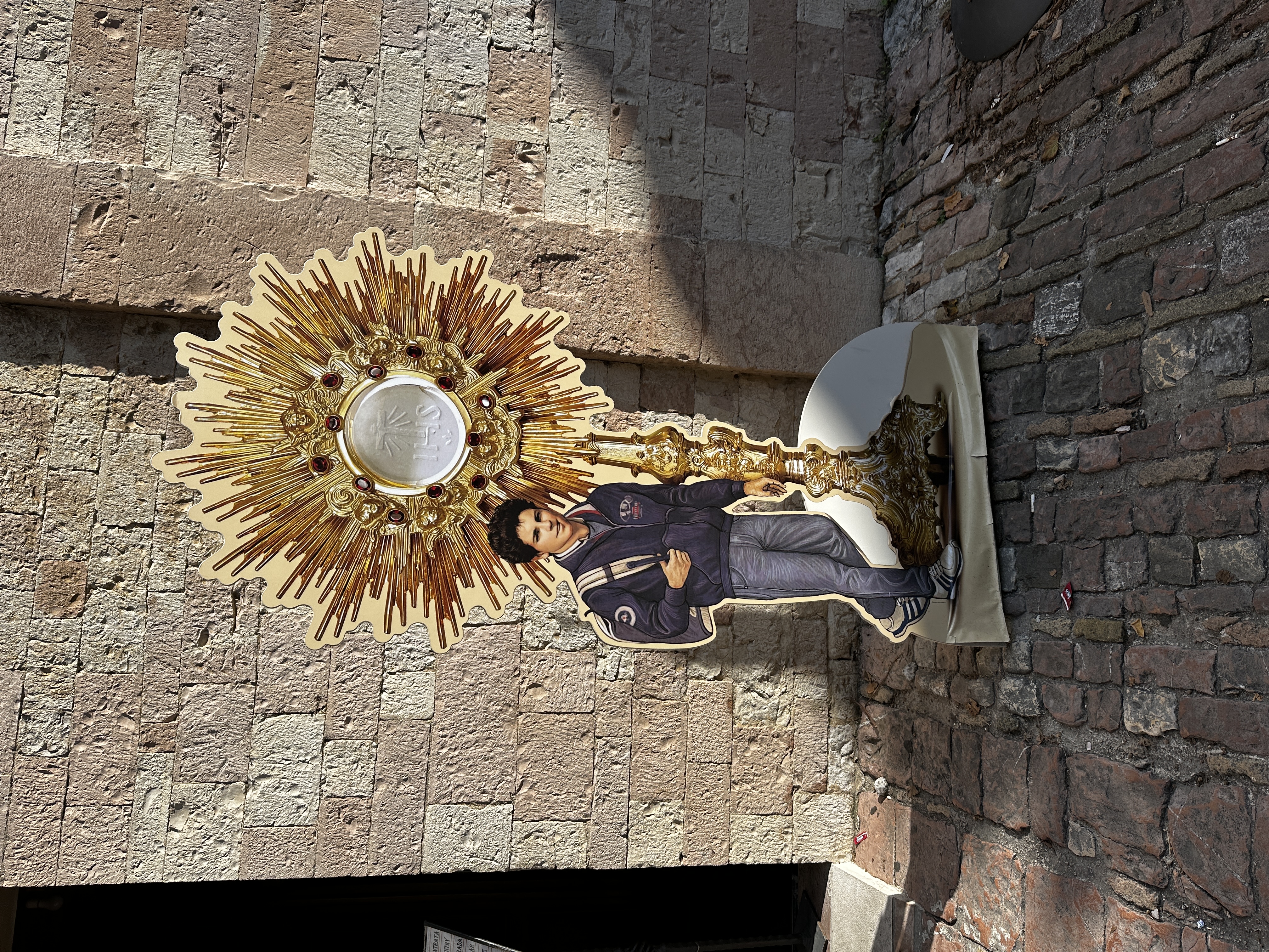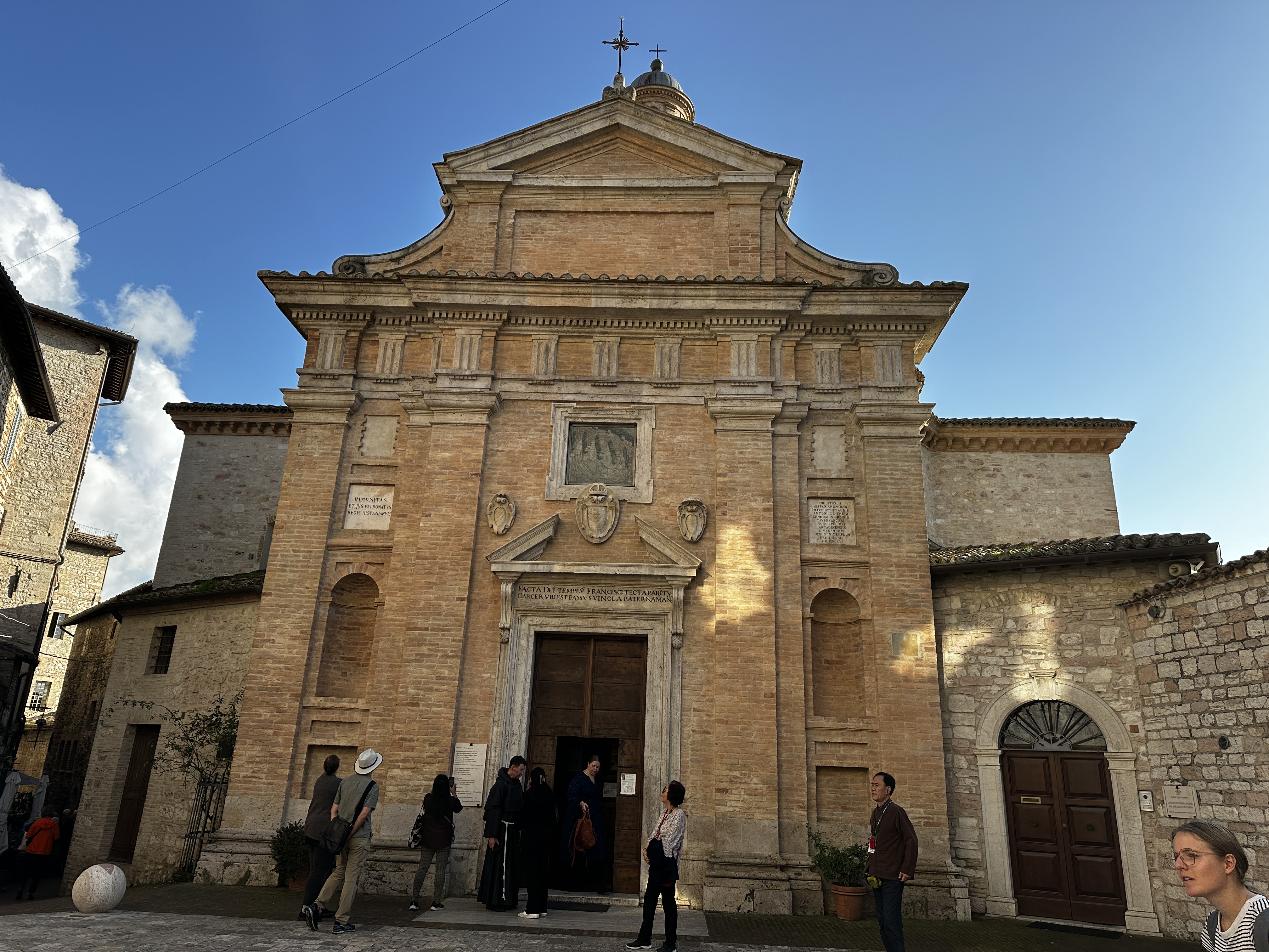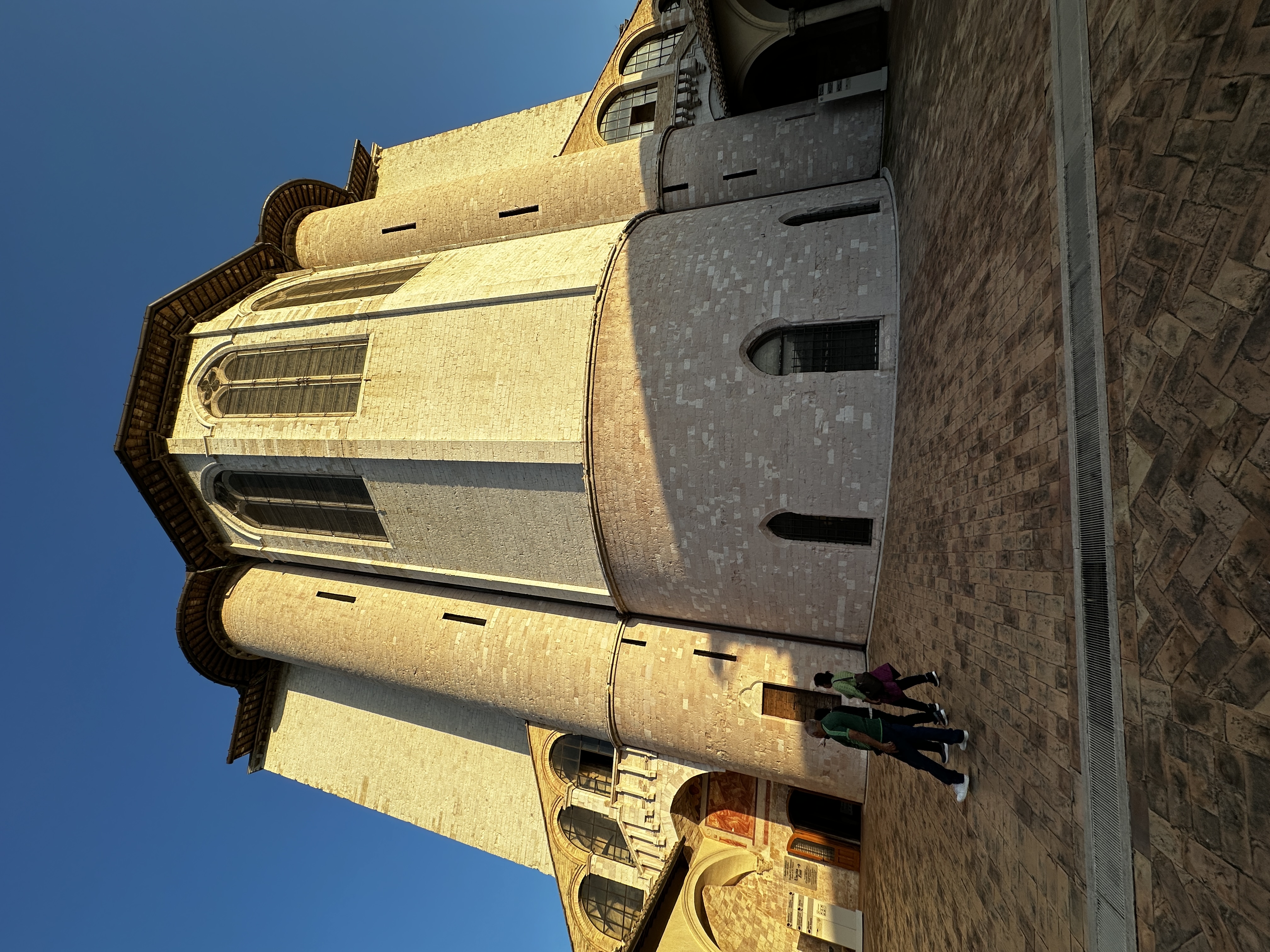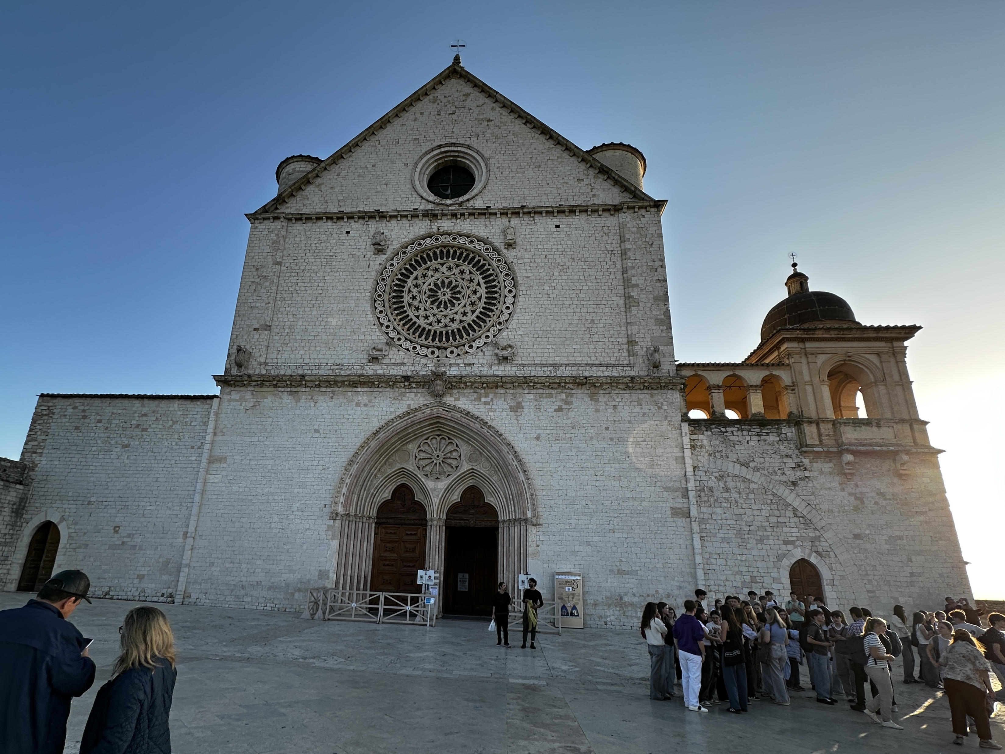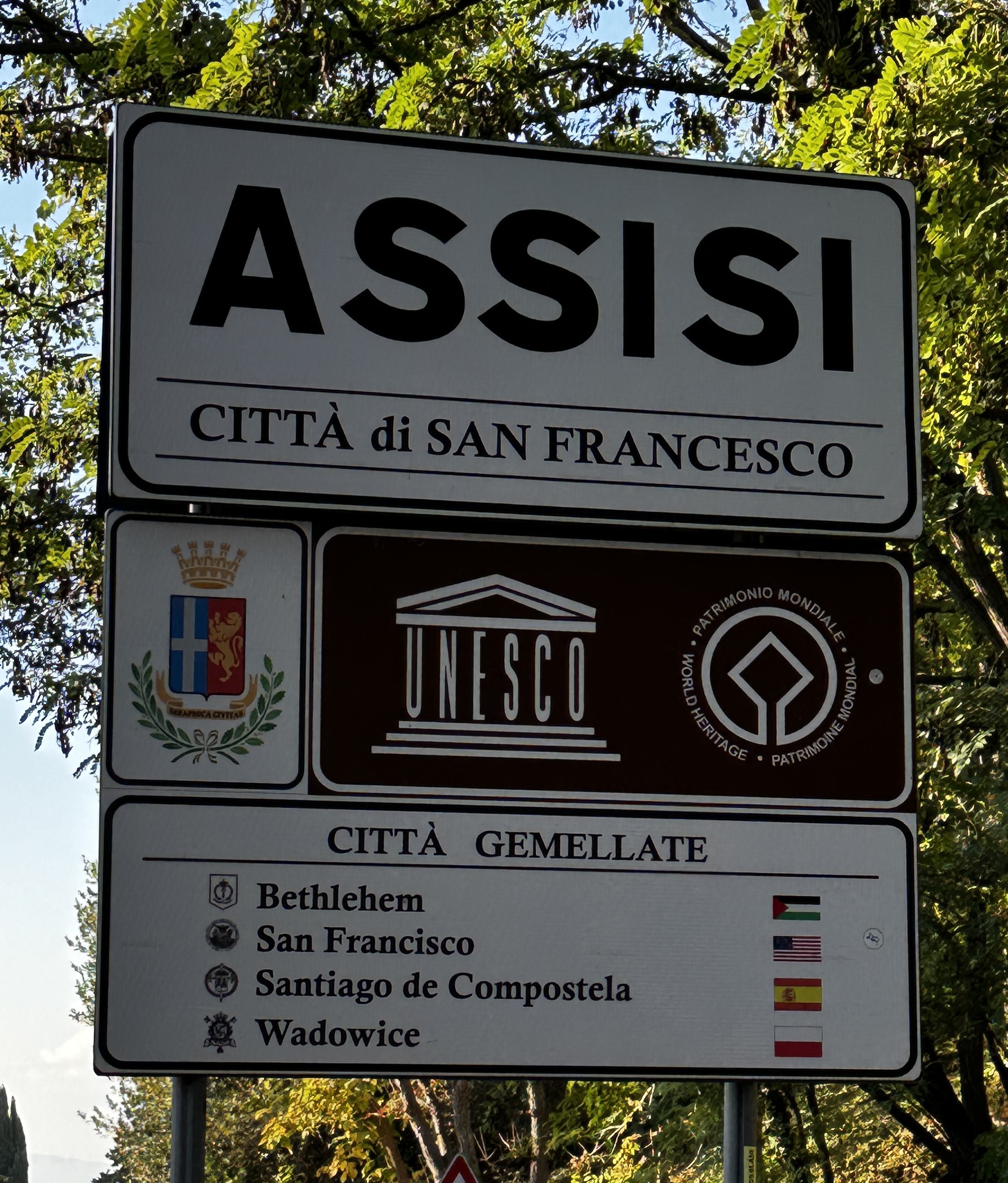 28 October 2024–Assisi, and Tour at an Unexpected Place: We visited Assisi already, you say! Yes, we did. Last Saturday. AND…after we had already returned, we learned about things at Assisi that we had not known about and therefore not seen. Thus, we set off on an extremely beautiful fall day in Umbria to see Assisi once again. We stopped at Santa Maria Maggiore in Assisi. This means that it is near the Basilica of St. Francis, but it is a totally different church in that same village. One must remember that “near” is a relative term. When talking about mountains and the fact that parking and driving is forbidden in the middle of town center, the distance takes some time on foot. The roads are cobblestone, with some steep uphill and downhill climbs. Nevertheless, Santa Maria Maggiore used to be the main Church of Assisi. Now, it no longer is. However, it is very often visited by people around the world. Why? Aside from the medieval beauty of this Church, there is a very important and influential person’s body therein, the body of Beatified Carlo Acutis. Carlo Acutis has been beatified, which means that he is on his way to sainthood. That also means that therefore, his body has been exhumed from his burial site and exposed in a glass sarcophagus in this Church. Carlo Acutis was also only 15 years old when he died. When one views his body, he is dressed in a sweatsuit (zipped sweatshirt with the #58 on the sleeve and something North in white lettering on the chest. He is wearing blue jeans and Nike gym shoes. He has a beautiful head of brown curly/wavy hair. He looks as if he is sleeping. His story is phenomenal, and I recommend that one Google it. It is phenomenal in its simplicity and common-person-nesss. He never received a stigmata, he was only 15, so he had not accomplished any major work, really, he was a technology geek, and he loved the Eucharist, and St. Francis of Assisi, as well as a handful of other saints. He is a regular kid who somehow made it to sainthood. And, yes, he technically already is a saint. The special group in the Catholic Church who is responsible for declaration of saints has already given its approval for Carlo Acutis to be advanced from Beatified to Saint, but the actual date of declaration by Pope Francis and celebration has not yet been announced! How awesome is that!!!??? In that same Church, there is a small section where the sign reads that it was there that Francis took off his clothes marking him as a rich person (his family had been quite wealthy) and declared his commitment to poverty instead. This is called the”Santuario della Spogliazione.” Just nearby is a powerful statue of St. Francis of Assisi’s parents. His mother is holding a broken chain. The significance is that in spite of her and her husband’s disappointment and anger that their son, Francis, would not only renounce the inheritance of wealth but also the father’s insistence on passing on and Francis receiving the family’s wealth of material things, the mother finally broke down and let Francis free, to break their imposed bond of family ties/ties to family wealth, so that Francis could pursue what he believed to have been his personal faith-driven goals. Still close to these sites and still in Assisi is the Chhiesa Nuova, one can see a statue of a young St. Francis on his knees inside a very small concrete room. He appears to have been beaten (his face). That is because this scene recalls the space where Francis’ father, angered at his son’s rejection of wealth and also of his earthly father’s imposed life direction, beat him and jailed him. I visited the house where St. Francis was born, as well as a teeny-tiny Church called Oratorio di San Francesco Piccolino. Finally, I wanted to see the. Basilica of San Francesco’s Chiesa Maggiore. I had attended Mass in the Chiesa Inferiore last Saturday evening, and I had never gone to the upper Church at all. Today, I climbed about 50 concrete steps to be able to see frescos by Giotto on the walls of this segment of the Basilica. After making it to the top, I found out that I could not enter the Chiesa Maggiore from that point of the structure. I needed to go back down and enter that Church only through the Chiesa Inferiore. Uggh! But I did as I was told—and I took no photos as I was told. Giotto had painted 28 frescos of the life of St. Francis. Each one is phenomenal. The church, itself, is absolutely beautiful! So, mission accomplished for today. Due to the time change and the late, slow start, daylight was beginning to wane, but not before I caught a fantastic sunset photo. I’ve been saying “I” this past week because Dad has not felt well since a week ago Saturday evening. Symptoms mimicked those of gastroenteritis, but there were other symptoms that we had been attempting to resolve in various ways, such as taking the advice of pharmacists, our family doc in the U.S. via text, and even the advice of a video-chat with a doc from Rome. Somehow, though, the symptoms were not going away. Today, they were so bad once again, and once again, Dad drove me to Assisi but could not walk about for any length of time/distance, and he spent his time in the car. We figured it was time to go to the ER. We ended up going to Pronto Soccorso (ER) in the Nuevo Ospedale di San Giovanni Battista in Foligno (about a half-hour drive from our B&B). Dad drove there because he felt OK enough to do so, and, after about four-to-six hours, the doc decided that he needed to be admitted. By this time, they found that his kidneys, liver, and perhaps even his heart had begun to “suffer” likely from the prolonged symptoms, that he needed to be stabilized and made comfortable, and that the cause needed to be identified in order to choose an appropriate and effective treatment plan. So, our unexpected tour of Italy today was also composed of experiencing the hospital system here. (I realize that we cannot generalize. We can only comment a