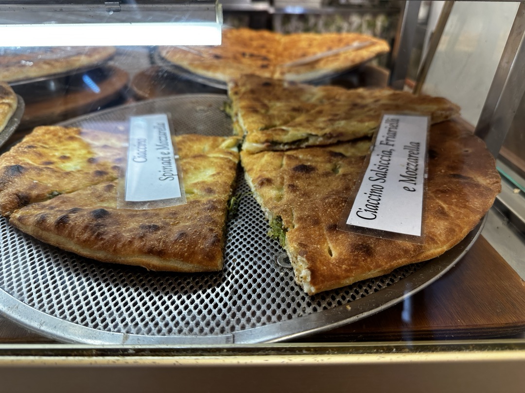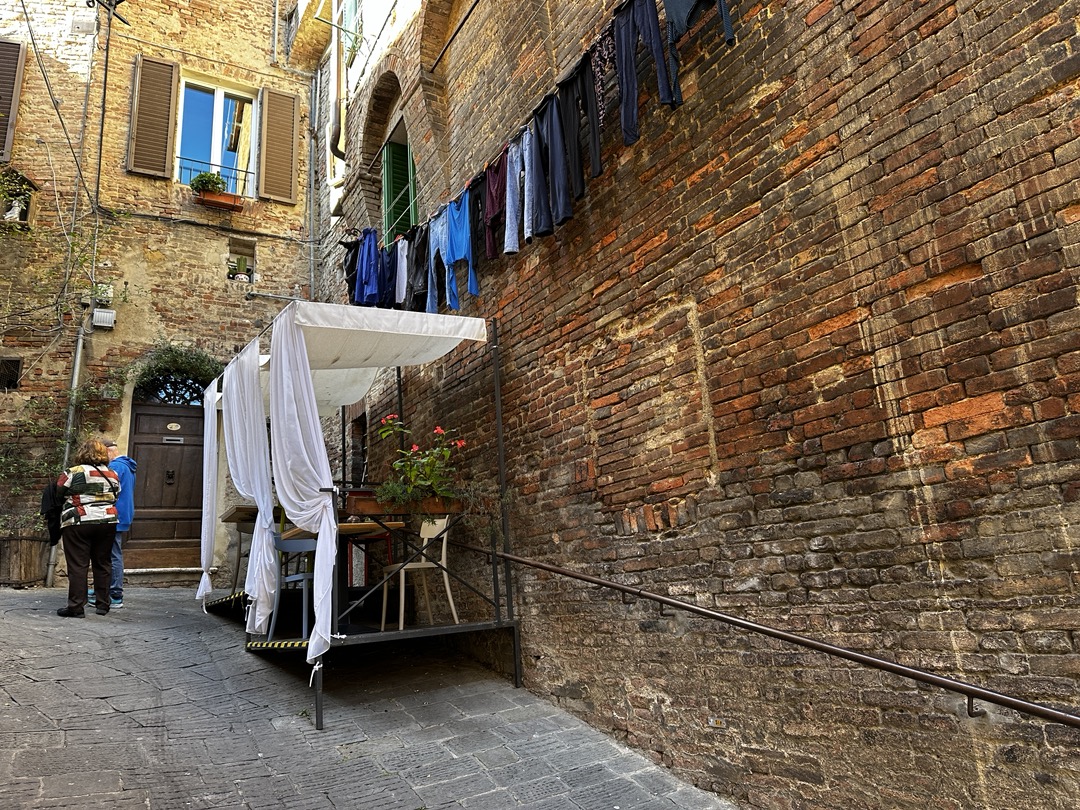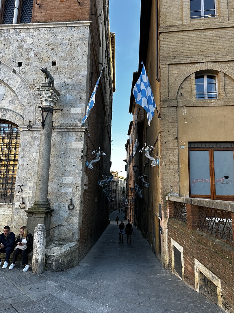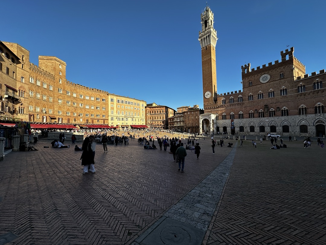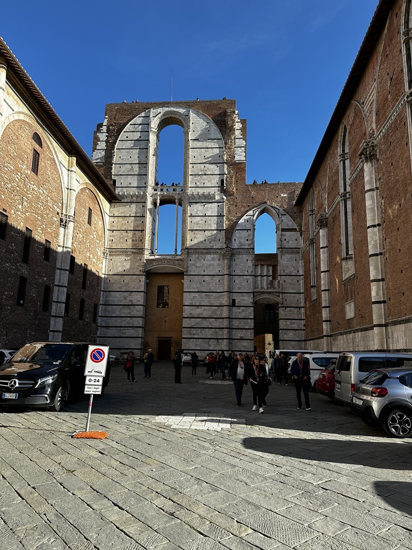 3 November 2024–Mass at “Il Cubo” and Road Trip to Siena: Sunday Mass this morning was within walking distance from our B&B in Foligno. In fact, it was right next to the Hospital in which John found himself for a few days. “Il Cubo” is not the Church’s real name, but it is called such because of its shape: it is shaped like a giant cube! From the outside, it looks like a large concrete block, and inside, it is extremely modern-looking, especially given the medieval surroundings in this part of the country. Our host told us that Siena would be mostly flat, so we figured that it would not entail more uphill and downhill walking, large number of stairs, an so on. We traveled to Siena. We found that although the main town center, once inside of it, might be mostly flat, one as to walk uphill to get to the town center, not unlike many other medieval towns. Then, of course, one must walk downhill to return to one’s car. Having said this, we did see one bus that perhaps would have driven us to the top, but we were not sure about the bus, so we walked. So, I’ve learned a couple of things during this trip to Italy: 1) When Locals say that, “e da vedere…e Bella,” one is saying literally, it is a must-see, it is beautiful, but what they mean by beautiful in this case, is that it is going to be a beautiful place from a historical perspective; and by historical, in these small towns, it typically means that it is going to be a Roman or medieval town; and 2) when Locals say that something is “in pianura,” literally meaning that it is on the first-floor level, i.e., that there is no climbing involved, what they really mean is that it is relatively flat, that it is on the “hill”, that it requires little or no up/down walking/stepping; and by “hill,” the Locals in the North and Central parts of Italy, they really mean what we call “mountains.” Anyway, the Cathedral (Duomo) of Siena is BEAUTIFUL! I think it ranks among the top duomos that we have seen so far, such as Florence and Milan, for example. It has a Baptistry, as well, not unlike Pisa. Florence, and such. An interesting part of the Duomo’s interior is the Biblioteca Piccolomini. One room has marble-looking Mass Books with musical notes as they must have looked in the Middle Ages. Of course, Siena has an university, but it also has palaces, Roman arcs, museums, other churches, and the like. There are vendors, gift shops, restaurants, bars, cafes, both in the piazza and lining the narrow streets. A walk to the Piazza del Campo leads to a huge “race track” twice a year, for what is called the Palio di Siena. This is a horse race, and traditionally Palios are competitions among the various neighborhoods of the same town. This “race track” is slanted to facilitate the race, there is a large fountain in one section of the piazza, and one could see Palio flags both lining narrow streets as well as intermittently flying by someone’s residence nearby. The Piazza is huge, and its circumference is lined with specialty shops, bars, cafes, restaurants, and other shops. In one of these shops, I noticed a very familiar wine bottle, one that sat on our kitchen table at every mealtime when I was growing up. My father used to enjoy Chianti wine in such bottles. Additionally, I could not resist purchasing a classical small panforte di Siena. Panforte is a dried fruit and nuts confection that for us was sent by our grandparents at Christmas as a gift, all the way to the U.S. Of course, this shop also sold the traditional Sienese cookie called the Ricciarelli (which looked to me somewhat like the cracked chocolate or lemon cookies at Christmas time). Siena, like most other medieval towns in Italy with entrenched culinary traditions, certainly has other specialties that were being sold in stores today, delicacies such as crostone (a sort of large toasted slice of bread, topped with whatever one desires, i..e., cheese, prosciutto, mortadella, and so on) and ciaccini (a sort of stuffed pizza). Of all of these, we only purchased a small panforte. Dinner was at Vesuvius Ristorante e Pizzeria in Foligno, like last night. Dad had eaten a filet last night that was not only delicious but it was also good in his stomach all night and today; therefore, he was happy to go there for the same item tonight. I love gnocchi, so I had Gnocchi a la Sorrentiina. These gnocchi were very delicious.