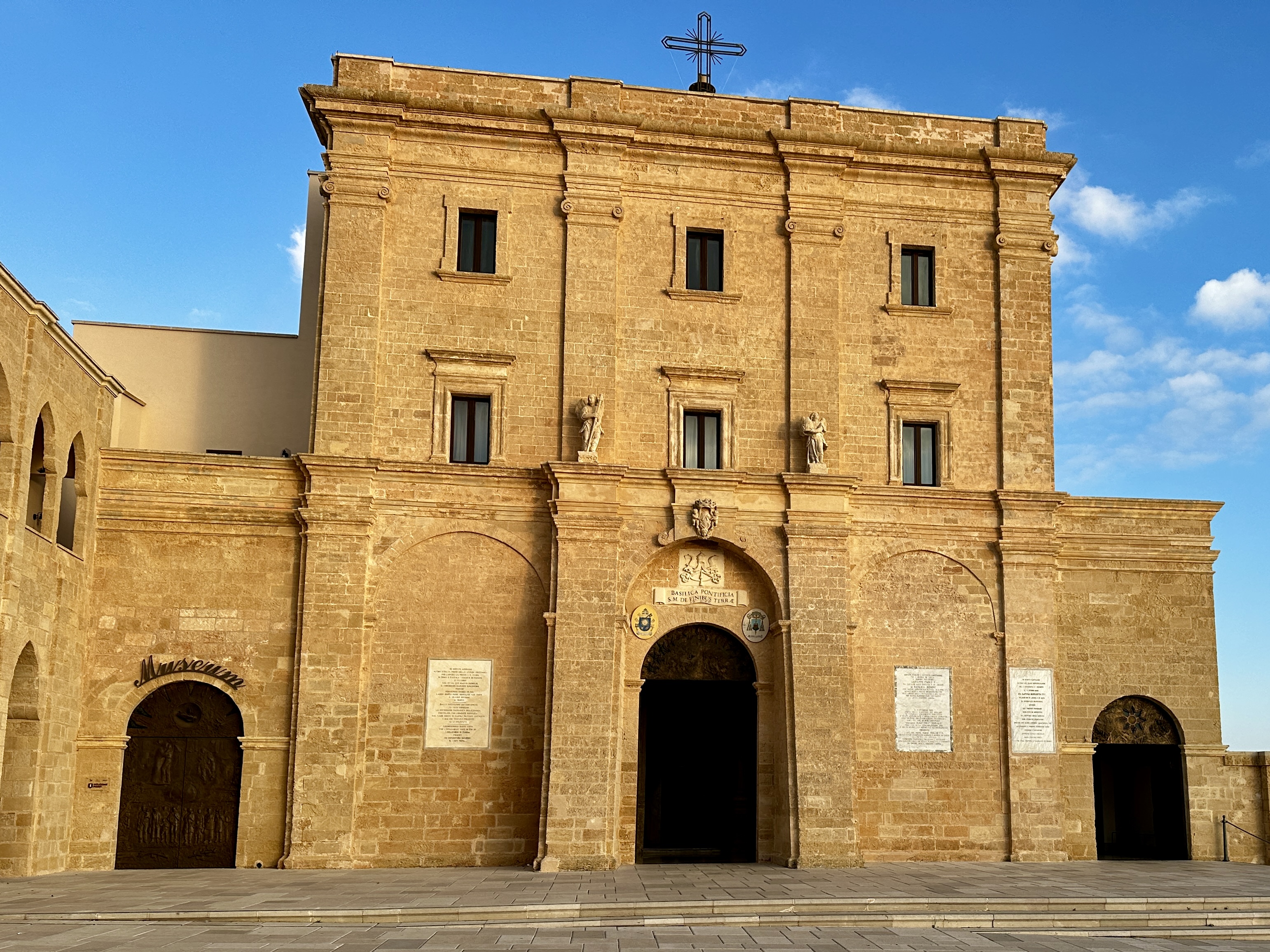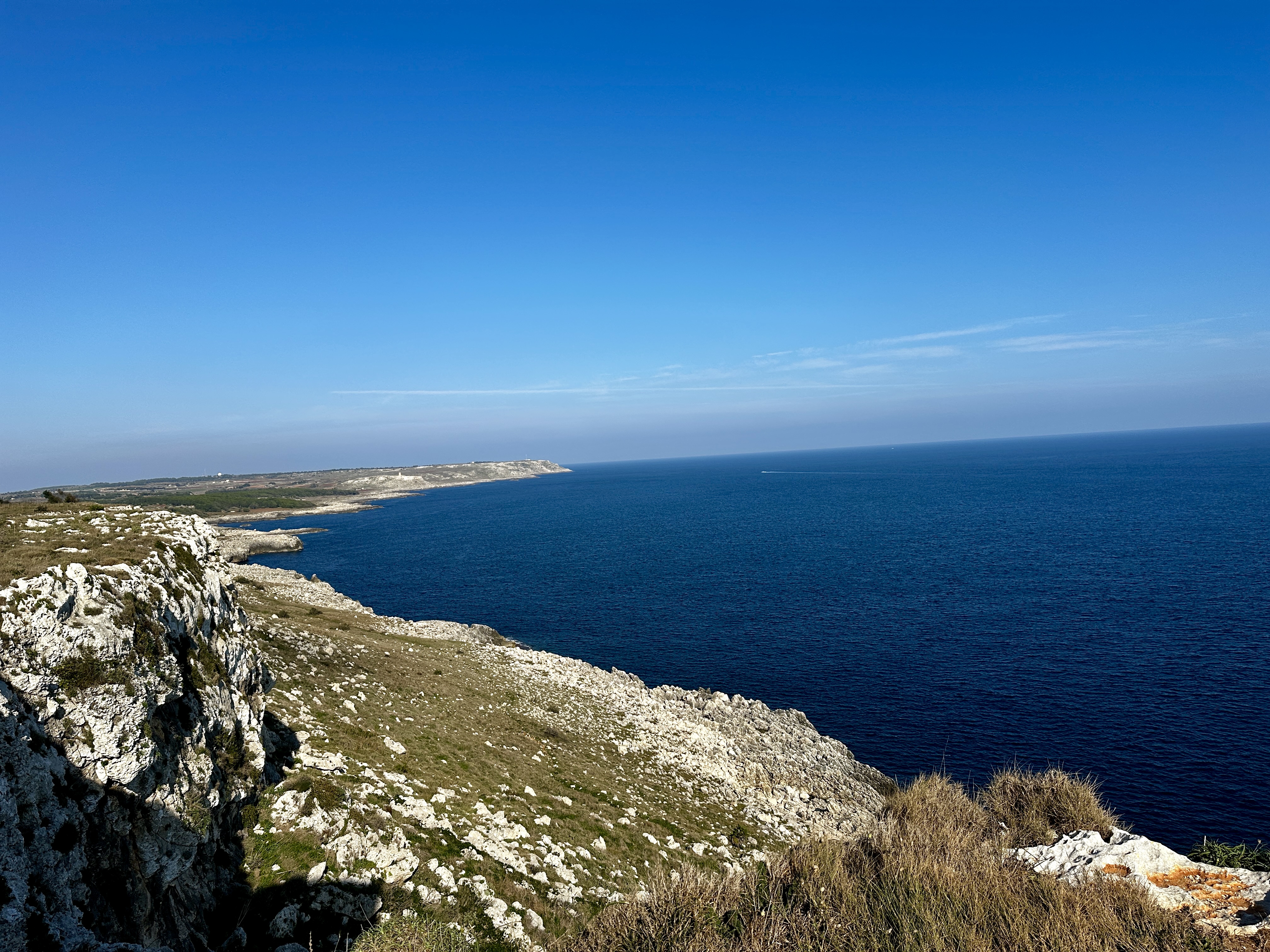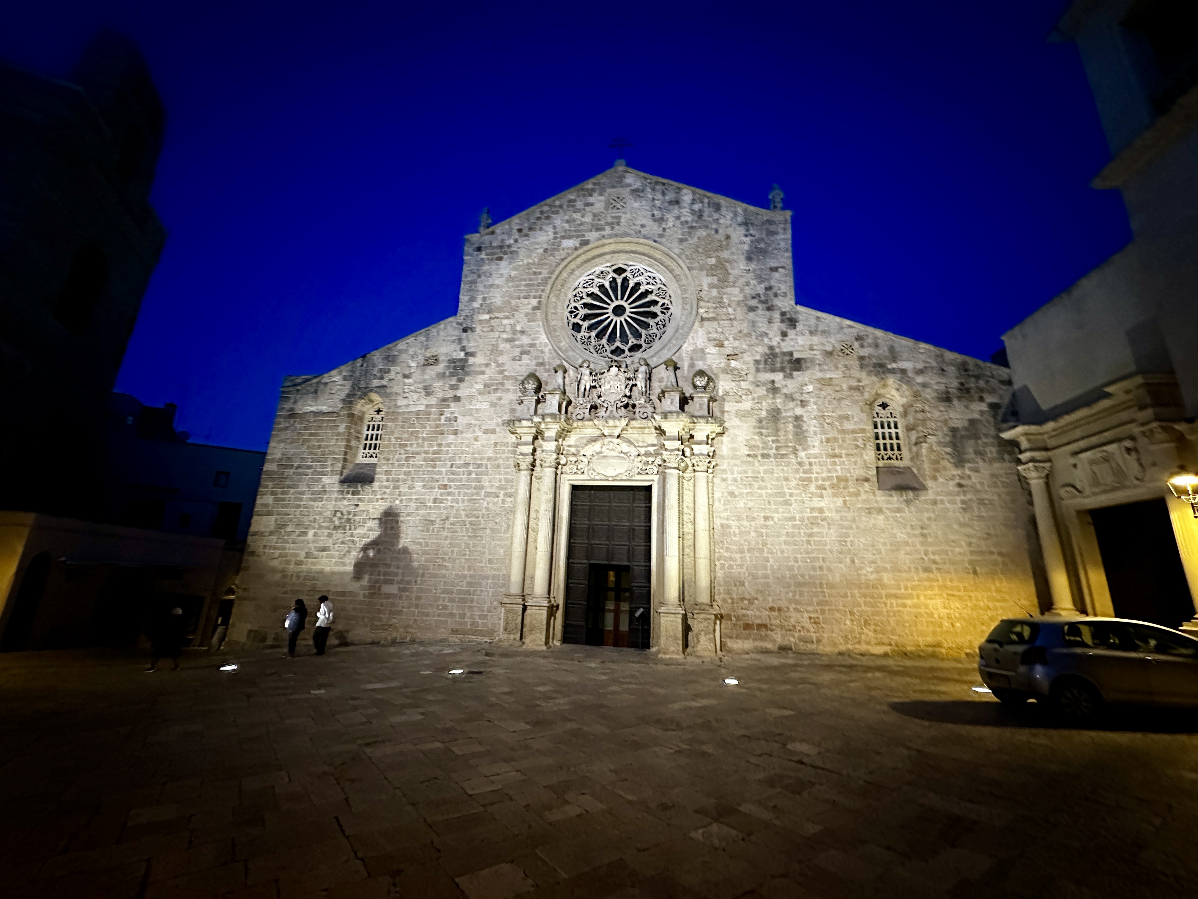 7 November 2024: Drive Along the Eastern Heel of the Italian Salento Peninsula: Lecce, Puglia to Leuca, Puglia—It was a beautiful sunny and warm day in Porto Cesareo this morning when we awoke, so we decided to tour the heel part of Italy, although we only got through the eastern part before it became dark and we turned back toward “home.” Nevertheless, it was a beautiful journey, with some stunning scenery, especially from Otranto to Leuca. But, Porto Cesareo is on the western coast of the Italian heel, on the Ionian Sea. We had to cross the Italian peninsula in order to access the Adriatic, western, side. The first city we came upon was Lecce. We stopped at a McDonald’s there and were greeted by two pooches in the McCafe line. There was another larger pooch politely accompanying its Human inside the store at a table. Yes, dogs are treated quite humanely throughout Italy. Of course, they were all leashed. Opposite the McDonald’s was the first movie theater I’ve seen in a long time, bordered by a Mexican Restaurant (the first one I’ve seen in Italy thus far), and other examples of Western influence. The rest of Lecce seems to be pretty large, with huge imposing concrete-looking structures, such as Churches, plenty of stores and shops, a university, music schools, palazzos, soccer paraphernalia stand/colors (red and yellow) and so on. The city seems to be pretty old, with some buildings showing their age. Vineyards and olive groves pepper the area just outside of the town center sections. We traveled to Otranto, Puglia on the eastern coast/Adriatic Sea side of the Italian Peninsula. However, we decided to travel on and return later in the day when the Cathedral would reopen at 3:00 P.M. We headed toward the southern tip of the heel, where the Adriatic and Ionian Seas join and split (the Adriatic on the East side and the Ionian on the west coast of the heel). The city we sought there was Leuca. The road along the Adriatic coast between Otranto and Leuca was stunning! Lots of rocky cliffs, light-colored, framing the azure Adriatic Sea. Plenty of palms, cacti, flowers, and other shrubs create a lovely landscape. Gardens along the “hill”sides gave an expanded definition of what a rock garden might look like. We passed several rocky structures on the hillsides that looked like rocky upside-down thimbles—much larger, of course. And, we passed several “torri”, towers. These were used as watch towers to protect against unwanted invaders by sea many years ago. We passed several small towns with restaurants, bars, cafes, B&Bs, villas, churches, and hotels. Most of the structures were white, not unlike Santorini, Ostuni, Mykonos, Alberobello—because the white color served the same purpose in these towns that can become quite warm, I suppose, in summertime. The whit coloring absorbs less heat from the sun during the summer. Interspersed among all of that beautiful whiteness, however, are yellows, oranges, and so on. Leuca was once considered to be the end of the earth that jutted out into the Sea, i.e.., the end of the Italian heel. Thus, there is a tall old lighthouse, and there is an old cathedral, called the Basilica of Santa Maria de Finibus Terrae. I love that name, Santa Maria of the End of the Earth! The sun was thinking about beginning the setting process over the Leuca and the Ionian Sea. It was brilliant as its rays were reflected in the water and formed a shadow over the predominately white Leuca city structures! We drove to Otranto. There, we were greeted by a huge Castle of Otranto, originally serving as a defensive structure against unwanted seafaring enemies. Tonight, it was hosting an art exhibit. But what we wanted to see was the Cathedral of Otranto. Not only does this Cathedral have a phenomenal mosaic that composes the floor of the Cathedral, but it also displays the bones of the 813 Martyrs of Otranto. When the Turks conquered Otranto in 1480, they demanded that the residents convert to Islam rather than to remain as Christians. When the residents declined, they were all killed, including their Archbishop. Men and boys 15 years old and over were killed; and women and children under 15 were sold into servitude. I believe that the 813 Martyrs have now been canonized as Saints. An obelisk and the majestic tall Leuca lighthouse appear to be standing side by side in the Piazza (but they are not side-by-side, of course). It was dark by now, so we dined at a restaurant in Otranto. The antipasto bowl that John and I shared had a mix of regional fried items, such as arancini with rice, eggplant “meatballs”, small curls of over roasted potatoes, and beautiful, scrumptious, I-could-eat-too-many fried bread dough balls. Dad had bombette (little rolls of pork stuffed with cheese and pancetta), and I had, wait-for-it…GNOCCHI Sorrentina.