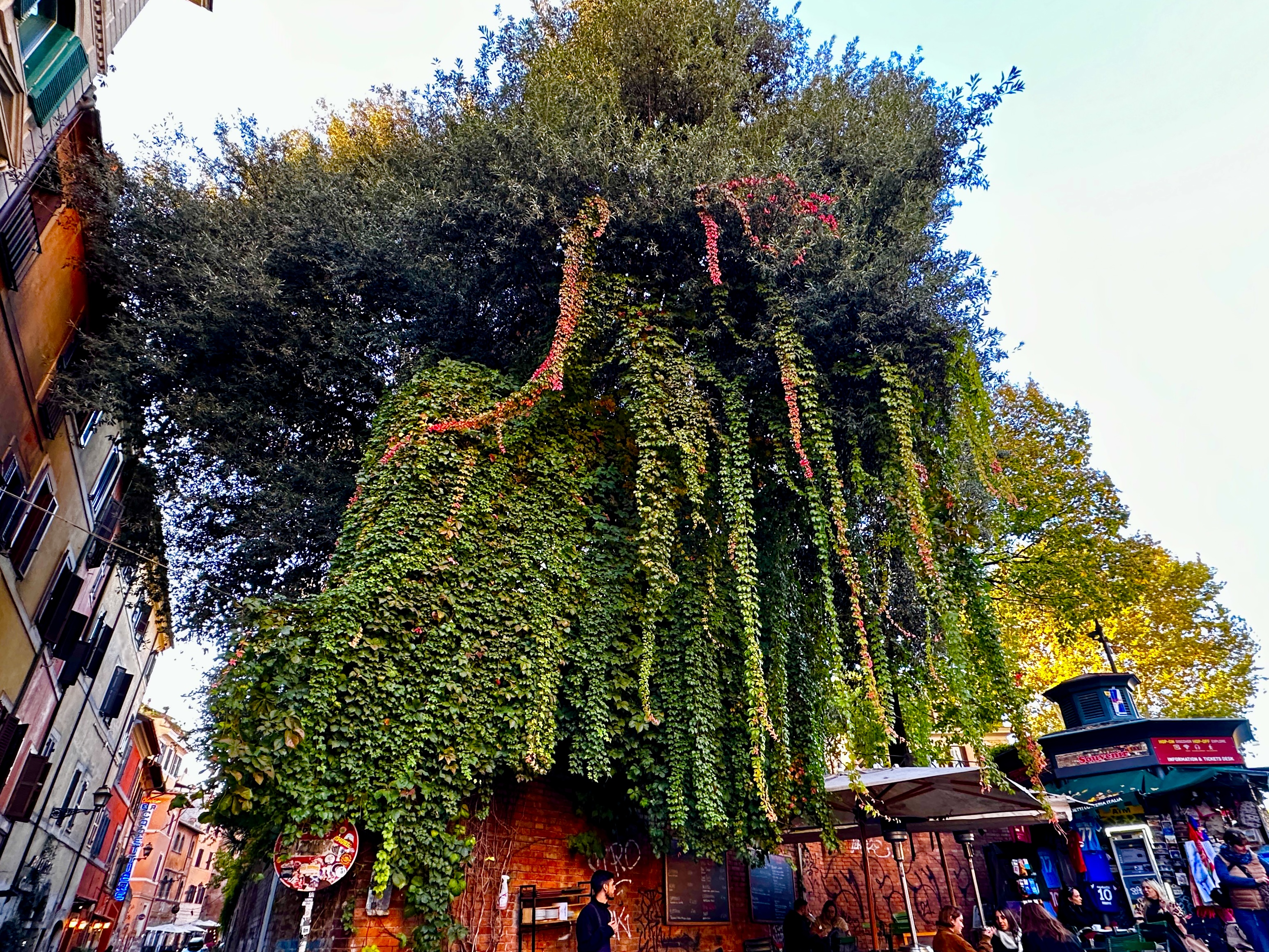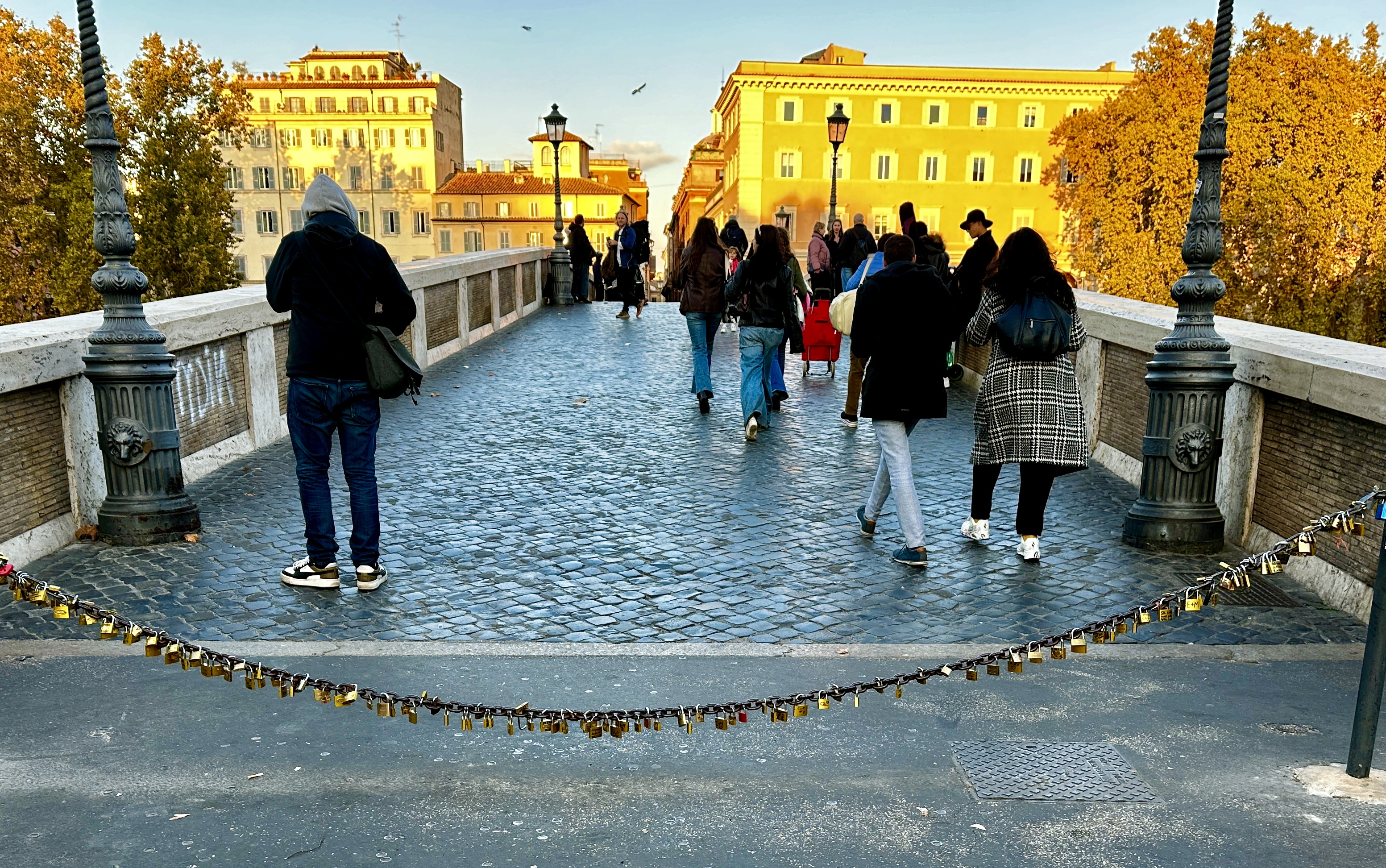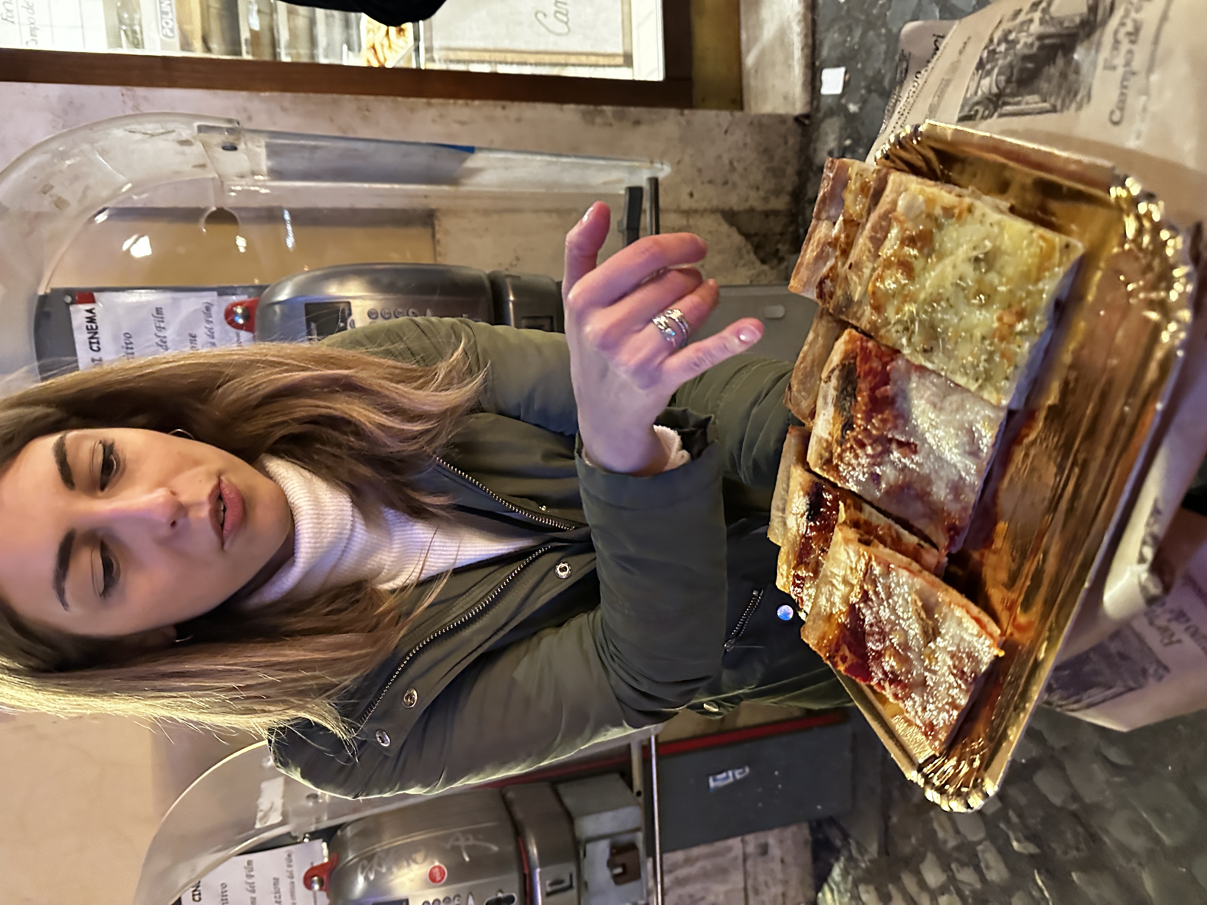 14 November 2024: Food Tour in Rome—This evening, we joined a small group of people in Rome for a food tour! The aim was to learn about and sample some of the Roman specialties from authentic family-owned venues who have been serving the public for many years (as in since the 1800s even). We walked and paused to sample something for 3.5 hours, and time went quickly. The Locals say that this is the first day of winter for them, a chillly 48 Fahrenheit. However, they rarely get any snow, and our taxi driver said that they tend to get about 10 days of winter per year, generally in January/February. So, today was a little bit early. Additionally, it appears as if this is about as cold as it gets here. But, with a light jacket and some good walking, it did not feel so bad. Dad and I arrived in Trastevere (a lively neighborhood of Rome) a little.bit early iin order to take an opportunity to tour it a little bit. Trastevere is a charming little section, with lots of greenery, graffiti and street art everywhere, shops, bars, cafes, gelaterias, restaurants, a Basilica, at least one other Church, and stores. Our cab driver claims that it is the best place for food. We wandered into the Basilica of Santa Maria di Trastevere, and it is gorgeous! It is so ornate and “gold” that it reminded me a little bit of Greek Orthodox Church decor. Our food tour would begin in the Campo di Fiore, though, another neighborhood of Rome, across the Tiber River from Trastevere. Thus, we walked across the Ponte Sesto, after crossing a “cordon” laden with love locks. The Campo di Fiore s where we met our group and tour guide, Cleia. We walked to an antipasto establishment. There, we had a variety of cheeses, including Pecorino Romano and Buffalo mozzarella among others, bread, and some local lunchmeats, including prosciutto, salami, and porchetta (a roast pork fillled with herbs and spices for flavoring). We washed it down with water and some white wine. The second stop was Roman pizza. Roman pizza is thin and crispy. We sampled margarita pizza and potato and rosemary pizza. We entered what used to be a gate bounding the Jewish Ghetto in the early 1900s. The gate is no longer there, but there is an entry point with a metal access. There are others in the area, so it is not specific to the Jewish Ghetto. The people here recall and honor October 16 every year. On that day, they recall the fateful October 16, 1943 when 1000+ Jewish residents were arrested by the Nazis, with only a handful ever having returned. Stumble stones mark the site where each of the missing/killed last resided/worked, and one of the 94-year-old survivors, Manuele, who lives in the town and others put flowers in front of each of their houses/workplaces. We stopped at a place where Stanley Tucci filmed one of his Italian food segments to taste fried artichokes and fried rice balls. The artichoke was quite interesting to see and to taste, and the rice ball, filled with white rice and perhaps some cheese and spices, was delicious. We tasted some local red wine. We walked past Old Rome (as in, very, very old, ruin-type Rome), the Portico d’Ottavia, which used to be temples to Roman gods. This complex was erected right by the Circus Fllaminius, where some horse races took place. We crossed the Isola Tiberina via the Ponte Fabricio toTrastevere. There, we had two Roman pasta specialties: Pasta Amatriciana and Cascio e Pepe tonnelloni. The Pasta Amatriciana is dressed with a red sauce and topped with guanciale, i..e.., pig jowls (pig cheeks). I had pasta al pomodoro e basilica (tomato and basil). Cacio e Pepe tonnelloni are thick spaghetti-like pasta noodles topped with oil, cheese, and pepper. We shared locally sourced white and/or red wine with this meal. The final stop was an award-winning gelateria. We could select two different flavors as part of this food tour. John chose chocolate and coffee gelato, and I had pomegranate and mandarin orange flavors in a cone. This was a beautiful way to experience this small part of Rome, and we appreciated the miniature city tour that Cleia was able to provide along the way.