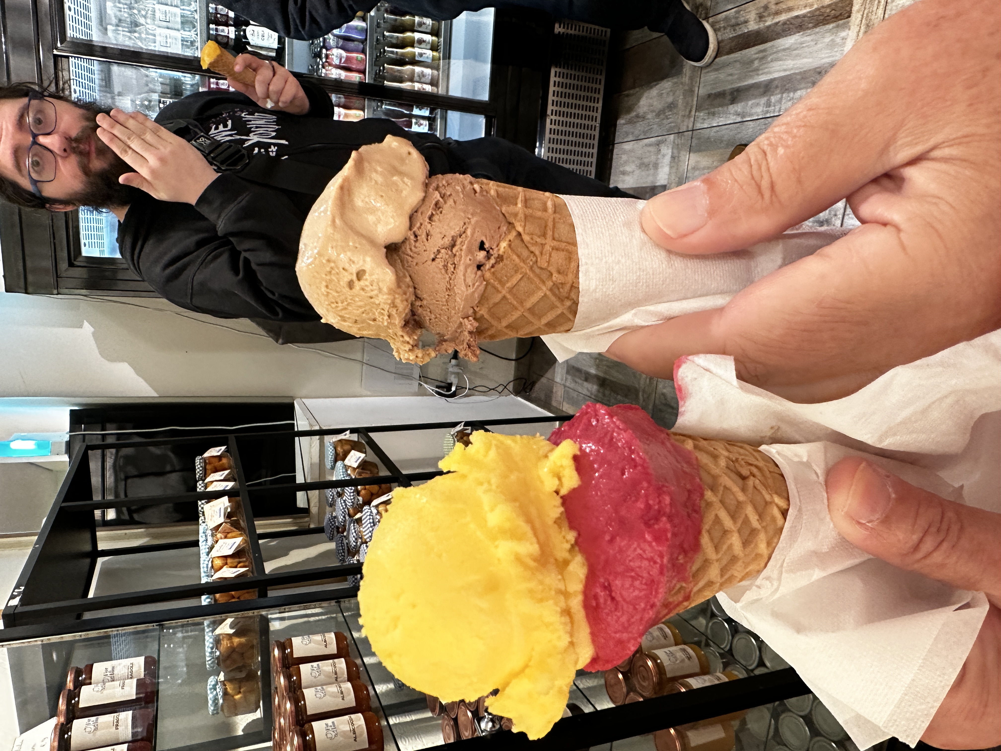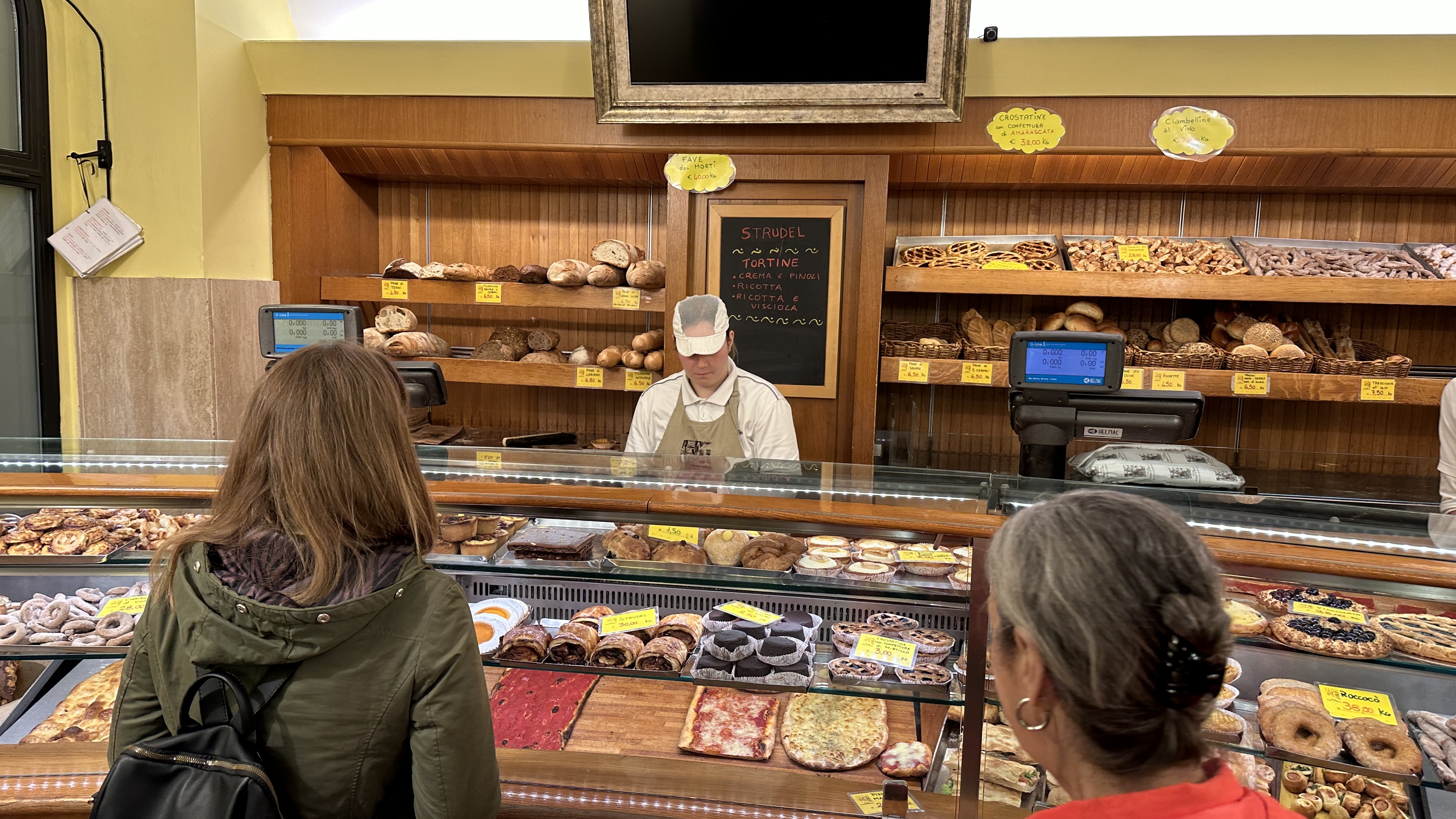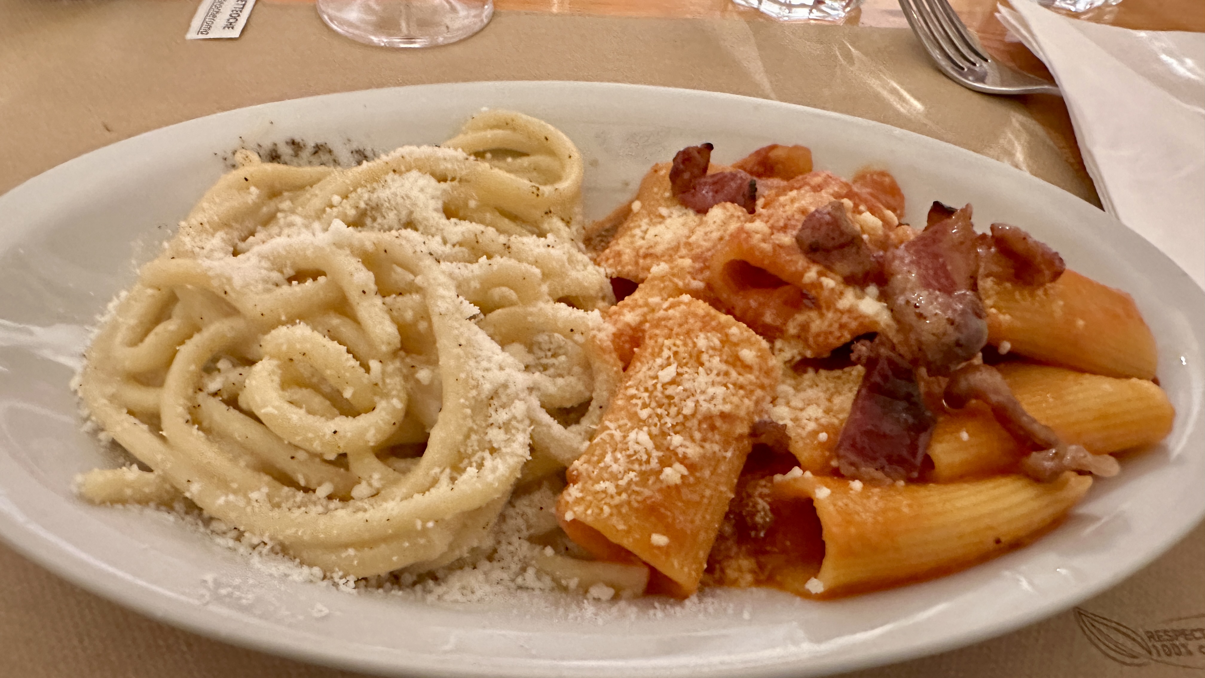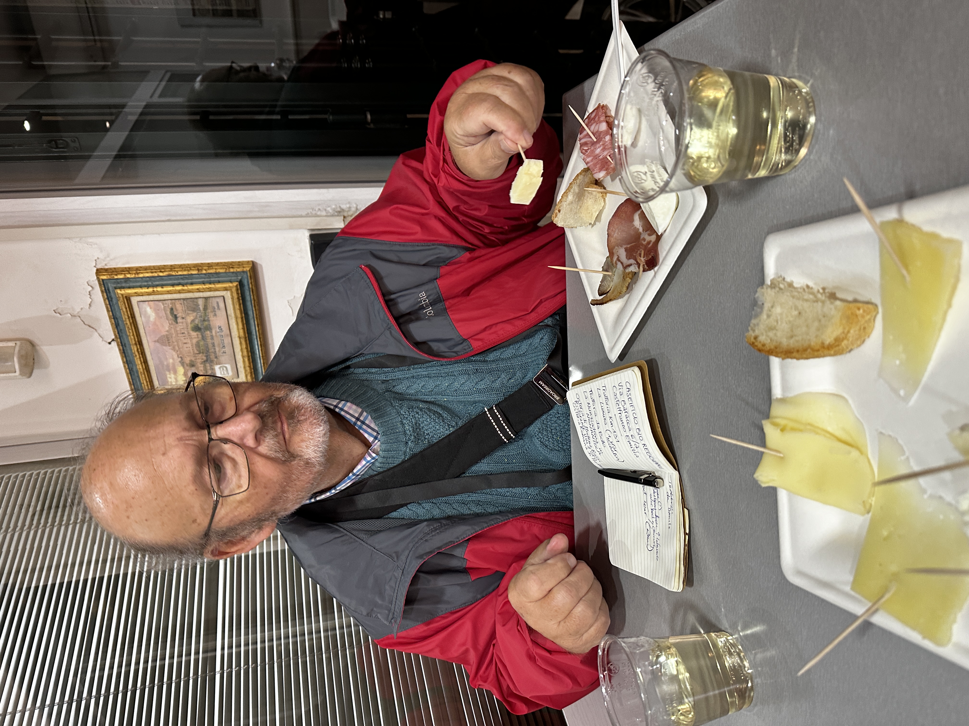 14 November 2024: Food Tour in Rome—This evening, we joined a small group of people in Rome for a food tour! The aim was to learn about and sample some of the Roman specialties from authentic family-owned venues who have been serving the public for many years (as in since the 1800s even). We walked and paused to sample something for 3.5 hours, and time went quickly. The Locals say that this is the first day of winter for them, a chillly 48 Fahrenheit. However, they rarely get any snow, and our taxi driver said that they tend to get about 10 days of winter per year, generally in January/February. So, today was a little bit early. Additionally, it appears as if this is about as cold as it gets here. But, with a light jacket and some good walking, it did not feel so bad. Dad and I arrived in Trastevere (a lively neighborhood of Rome) a little.bit early iin order to take an opportunity to tour it a little bit. Trastevere is a charming little section, with lots of greenery, graffiti and street art everywhere, shops, bars, cafes, gelaterias, restaurants, a Basilica, at least one other Church, and stores. Our cab driver claims that it is the best place for food. We wandered into the Basilica of Santa Maria di Trastevere, and it is gorgeous! It is so ornate and “gold” that it reminded me a little bit of Greek Orthodox Church decor. Our food tour would begin in the Campo di Fiore, though, another neighborhood of Rome, across the Tiber River from Trastevere. Thus, we walked across the Ponte Sesto, after crossing a “cordon” laden with love locks. The Campo di Fiore s where we met our group and tour guide, Cleia. We walked to an antipasto establishment. There, we had a variety of cheeses, including Pecorino Romano and Buffalo mozzarella among others, bread, and some local lunchmeats, including prosciutto, salami, and porchetta (a roast pork fillled with herbs and spices for flavoring). We washed it down with water and some white wine. The second stop was Roman pizza. Roman pizza is thin and crispy. We sampled margarita pizza and potato and rosemary pizza. We entered what used to be a gate bounding the Jewish Ghetto in the early 1900s. The gate is no longer there, but there is an entry point with a metal access. There are others in the area, so it is not specific to the Jewish Ghetto. The people here recall and honor October 16 every year. On that day, they recall the fateful October 16, 1943 when 1000+ Jewish residents were arrested by the Nazis, with only a handful ever having returned. Stumble stones mark the site where each of the missing/killed last resided/worked, and one of the 94-year-old survivors, Manuele, who lives in the town and others put flowers in front of each of their houses/workplaces. We stopped at a place where Stanley Tucci filmed one of his Italian food segments to taste fried artichokes and fried rice balls. The artichoke was quite interesting to see and to taste, and the rice ball, filled with white rice and perhaps some cheese and spices, was delicious. We tasted some local red wine. We walked past Old Rome (as in, very, very old, ruin-type Rome), the Portico d’Ottavia, which used to be temples to Roman gods. This complex was erected right by the Circus Fllaminius, where some horse races took place. We crossed the Isola Tiberina via the Ponte Fabricio toTrastevere. There, we had two Roman pasta specialties: Pasta Amatriciana and Cascio e Pepe tonnelloni. The Pasta Amatriciana is dressed with a red sauce and topped with guanciale, i..e.., pig jowls (pig cheeks). I had pasta al pomodoro e basilica (tomato and basil). Cacio e Pepe tonnelloni are thick spaghetti-like pasta noodles topped with oil, cheese, and pepper. We shared locally sourced white and/or red wine with this meal. The final stop was an award-winning gelateria. We could select two different flavors as part of this food tour. John chose chocolate and coffee gelato, and I had pomegranate and mandarin orange flavors in a cone. This was a beautiful way to experience this small part of Rome, and we appreciated the miniature city tour that Cleia was able to provide along the way.