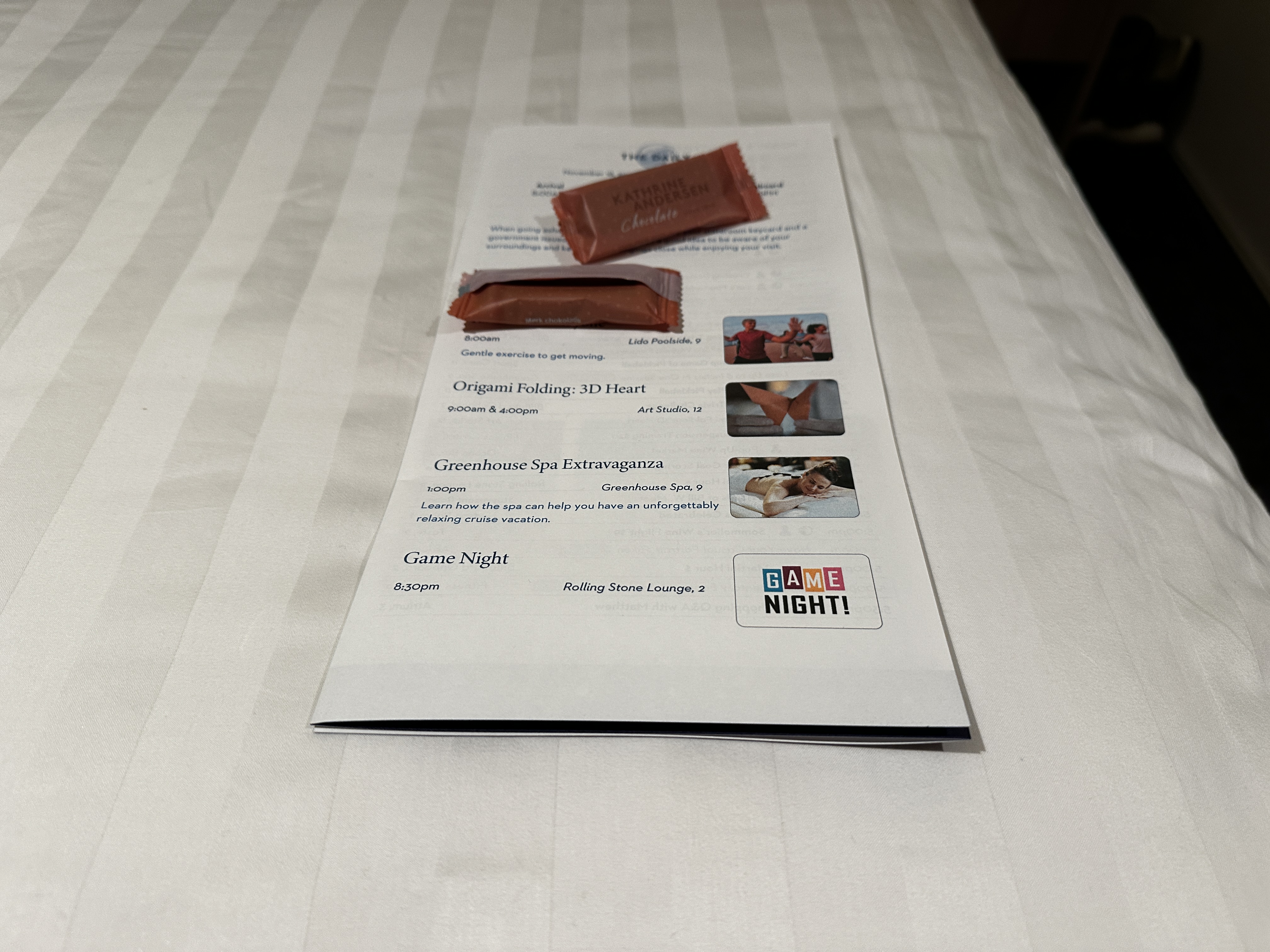 17 November 2024–Sea Day—St. Bonifacio Strait between Corsica and Sardinia and sailing on the Mediterranean Sea toward Cartagena, Spain—Ship stuff, i.e., eat, eat, Dutch Tea in the afternoon, presentations (on Olives/olive crop/olive oil, olive trees; on possible port excursions, on the ports themselves), Pantheon singers performance, sunset, onboard walking, and such. Sometimes, the water gets a little choppier when the ship goes through straits, but I did not notice it at all. John, who had gotten up to use the restroom, anyway, noticed that the hangers in the closet were clanging a little bit. We went through the Strait at around midnight, and thereby we officially sailed away from our beloved Italy. I will say that when the Pantheon performers sang a song in Italian (the singers are from Trieste, Sicily, and Rome), just hearing the language that for me had become second nature since 12 September brought back a ton of emotion for a little while. I love our cabin. We are on the 11th of 12 decks. We are also the second-to-last cabin in our row of cabins. The exit door to the 11th floor walking path is only two doors away. They say that it is best to be in the middle of the ship to avoid feeling the ship’s motion, but so far, this cabin has been fantastic! (It helps that the sea has been so calm)! Tomorrow, we dock at Cartagena, Spain. John and I have decided to hop off the ship and tour about on our own. The ship will supposedly dock within walking distance to the center of town, so we will try to see what we can see for as long as we want to see it, and we will look for a sample of sangria and perhaps some yummy tapas, for which Cartagena is known.