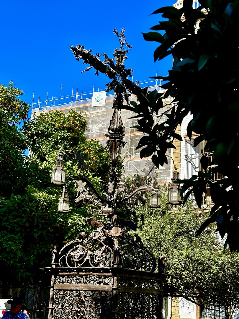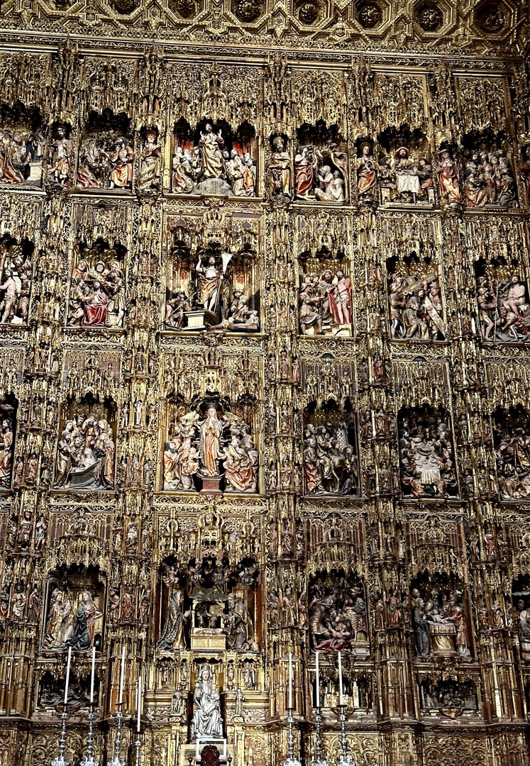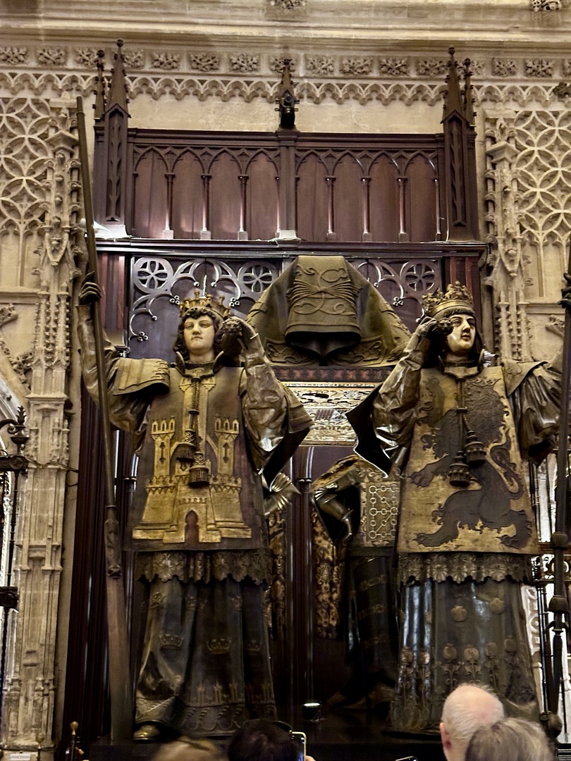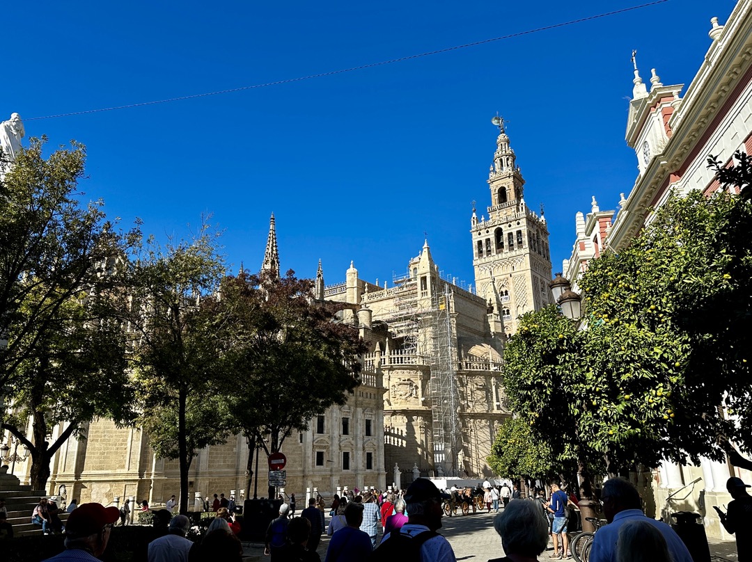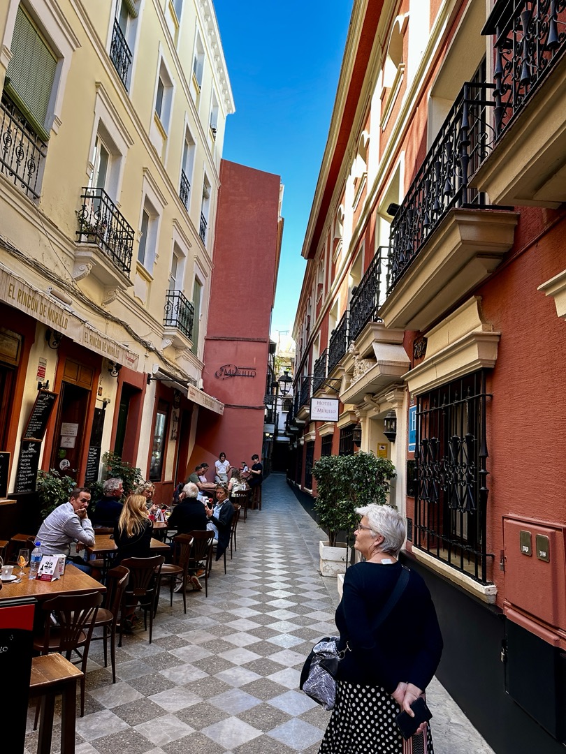 20 November 2024–Cadiz, Spain: We pulled into the port of Cadiz, the oldest port in South Spain. Cadiz is an island, a small City in Andalusia, Spain. It is connected to the Magic Triangle of Spain via the Constitution Bridge. I chose to take the tour from Cadiz to Seville, Sevilla, Andalusia, Spain. John chose to stay onboard and read in the sun, or otherwise relax. The weather was gorgeous again, sunny and comfortably warm—about low 70s F. Herein, I will share a little bit about what our tour guide explained to us. Cadiz is a city on the Coast of Light, where it is never too warm, and there is no winter there. There is an average of 300 days per year of sunlight. It has sandy beaches, tan/gold sand. It earned an award for the warmest, clearest waters. Water temps in November range between 72-77 F. Today, I saw what appeared to have been dried palm fronds/dried seaweed/straw-looking debris where the water meets the shore, so it was a little different from the manicured beaches one sometimes sees in Florida, for example. People were on the beach, however, and someone was even in the water, clearly relishing this beautiful weather/spot. Seville is one of the largest cities in Spain. It has no beaches, and it tends to get very hot in the summer sometimes. Today, it was warm enough for us to sweat as we hustled/walked through the center of town, but it was sunny and comfortably warm with no need of a jacket or sweater. On the way to Seville, about 1 1/2-hour drive from Cadiz, we drove past beaches along the coast of the Magic Triangle. The Magic Triangle is the area between Cadiz and Seville. La Frontera is one of the sections of that region. We learned that the Magic Triangle boasts a long stretch of beautiful golden-sand fine-grain beaches that are used by locals and tourists year-round. Tuna fishing is a big event around May of every year. Only large tunas, minimum of 132 lbs., are caught through a “sustainable” method called almadrama, which means “least fight.” “Sort of like bullfighting but under water.” Another delicacy that come from the waters in this area is sardines. They are skewered with palms and roasted on an open fire. The Magic Triangle produces cotton (on its rich dark soil), Palomino grapes (on its largely-limestone “white” soil) that produce sherry (cannot be called sherry unless it is grown/produced in La Frontera, cereals, and fruits. We saw a “typical town” along the road, with a church at a high point on a low hill and white buildings/structures all around the lower part of the hill. The white-washed villages are common in this area, as they are in Italy and Greece. As we approached Seville, we passed beautiful lush green parks, palaces, many of which have been turned into museums or hotels, beautiful palm trees, orange trees (these oranges are just decorative, however. No one collects them. The Locals prefer the delicious larger oranges that grow in this region), and a tree with HUGE dramatic roots above ground. We passed a bridge, currently under repair, built to commemorate the 500th year of the discovery of America (1492-1992). The discovery of America opened up avenues for trade. Seville is the center for trade with America, and from this, Seville has become a wealthy city. The buildings in Seville are beautiful, colorful, quintessential “Spain.” We visited the Plaza de Espana through a brick portal. Little did we know what would await us on the other side. This is a HUGE open plaza, a stunning plaza, with a large fountain in the center, bridges decorated in colorful mosaics, lagoons, mosaic representations of key historical events for Spain, …. A feature of this tour was lunch at a local Spanish restaurant. We stopped at the Restaurant San Marcos. The main dish was delicious: chicken in a sweet sherry, raisin, and potato sauce. As a group, we walked some of the narrow streets in “monumental Seville,” an area where “No Locals live; there are only tourists.” By “narrow”, I mean that only two people can walk side-by-side at any given time in some of these streets. The streets are lined with hotels, shops, restaurants, and colorful buildings. The restaurants are multi-ethnic, judging by the names and the menus, reflecting the thriving international tourist industry in Seville, and the city’s historical ventures. Many of the gift shops sell beautiful, colorful, intricate, hand-crafted mosaic pieces. The process used in creating these mosaic pieces is called “arista.” Arabic and Jewish influences are prominent throughout. We walked through the Jewish quarter and learned about the Legend of Susana (a love story gone tragically wrong). We saw the symbol of Seville, Las Cruces (a large ornate, metal Crucifix) monument. This tour also included entry to the Catedrale de Seville, aka La Giralda by the locals, and officially Catedrale de Santa Maria. It is known as La Giralda after the spinning weather vane at the top of the Bell Tower “La Giralda” on its premises. This Cathedral is the third largest in the world: St. Peter, Rome; St. Paul, Brazil; and Holy Mary, Seville. In the entryway to the Cathedral, on the ceiling, is an alligator and a bull horn. Inside the Cathedral., one can find the Tomb of Christopher Columbus, although his body moved around a lot, depending on who conquered whom, and so on. Supposedly, this is where he currently lies. The main altar of this Cathedral is breathtaking! It is surrounding by an extremely intricate/elaborate wooden sculpted creation that must be seen to comprehend its splendor. But one immediately is drawn to huge silver sculptures/structures that are then carried in the famous neighborhood processions that take place during the Santa Semana (Holy Week) every year. Our final visit during our tour to Seville was to the Pilates House, which is a huge elaborate palace that is still visited by its owners every now and then. It is another beautiful structure that is decorated with intric