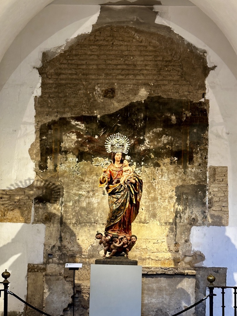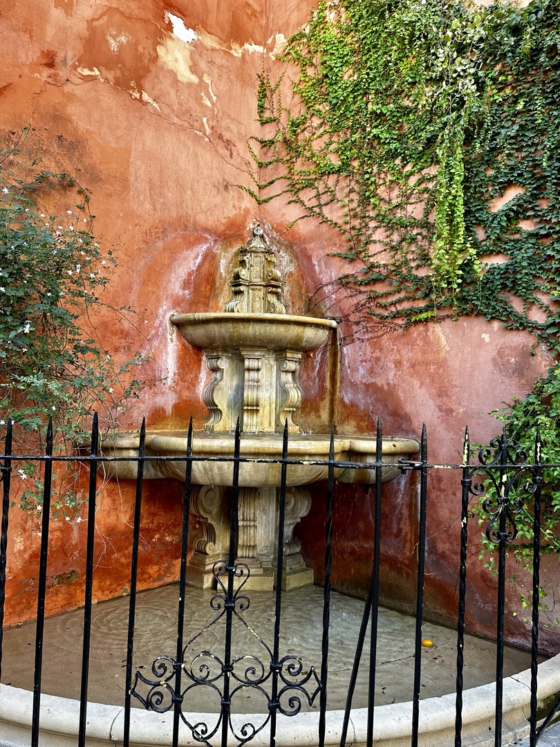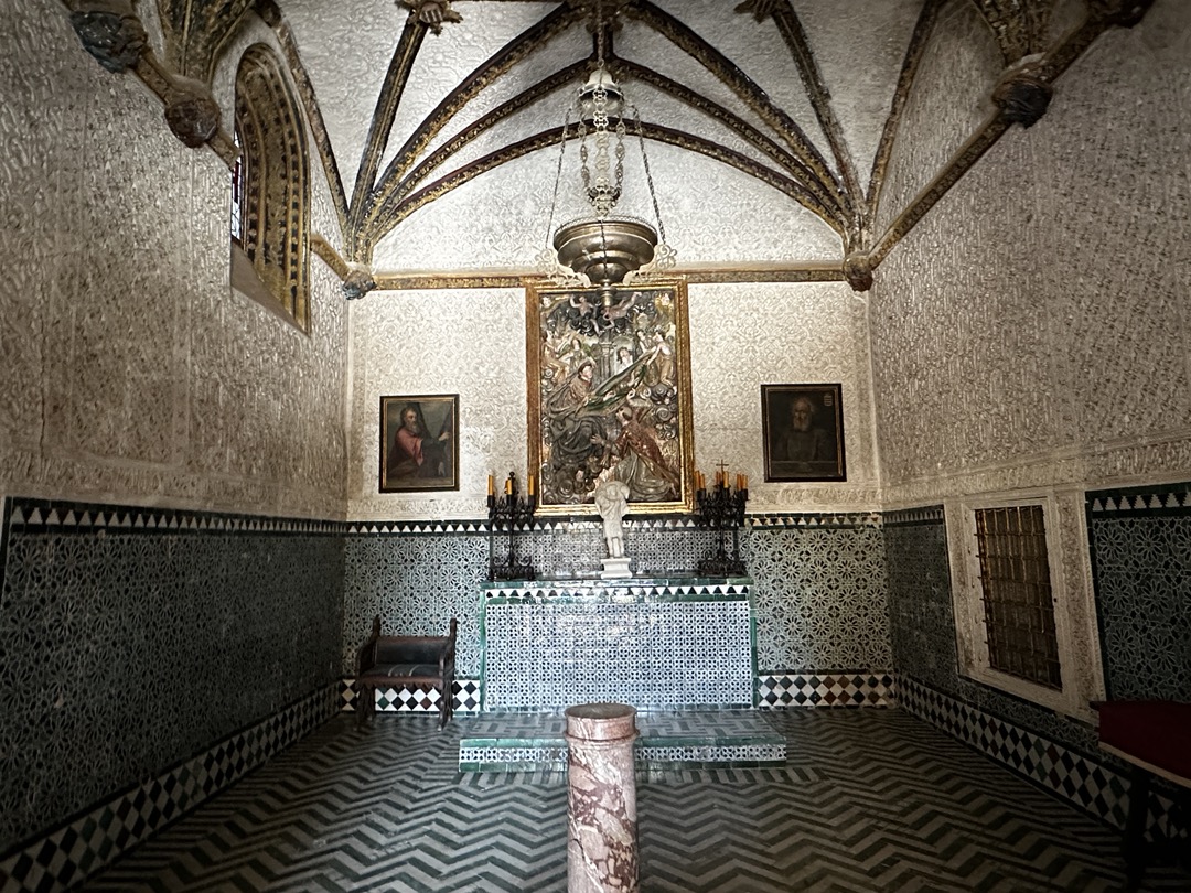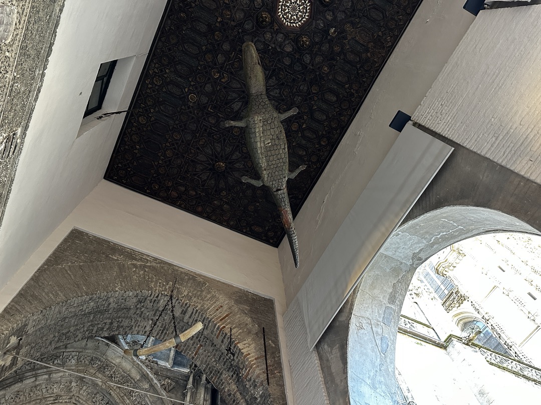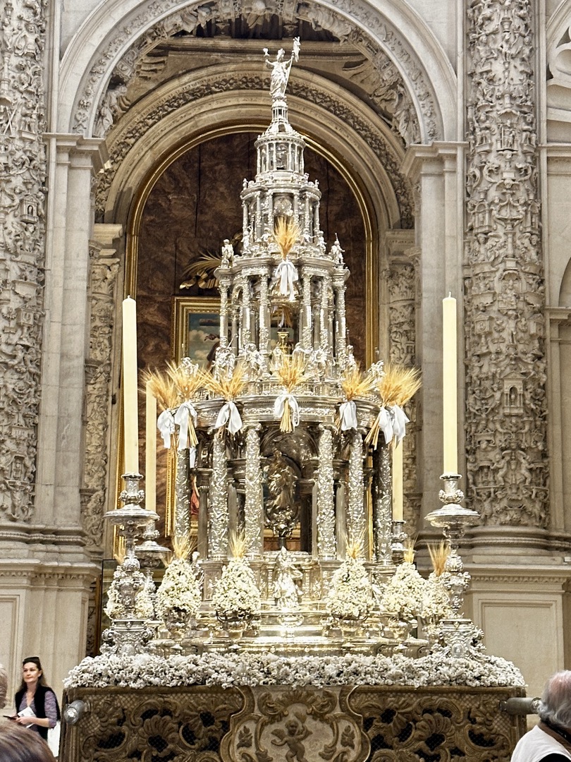 20 November 2024–Cadiz, Spain: We pulled into the port of Cadiz, the oldest port in South Spain. Cadiz is an island, a small City in Andalusia, Spain. It is connected to the Magic Triangle of Spain via the Constitution Bridge. I chose to take the tour from Cadiz to Seville, Sevilla, Andalusia, Spain. John chose to stay onboard and read in the sun, or otherwise relax. The weather was gorgeous again, sunny and comfortably warm—about low 70s F. Herein, I will share a little bit about what our tour guide explained to us. Cadiz is a city on the Coast of Light, where it is never too warm, and there is no winter there. There is an average of 300 days per year of sunlight. It has sandy beaches, tan/gold sand. It earned an award for the warmest, clearest waters. Water temps in November range between 72-77 F. Today, I saw what appeared to have been dried palm fronds/dried seaweed/straw-looking debris where the water meets the shore, so it was a little different from the manicured beaches one sometimes sees in Florida, for example. People were on the beach, however, and someone was even in the water, clearly relishing this beautiful weather/spot. Seville is one of the largest cities in Spain. It has no beaches, and it tends to get very hot in the summer sometimes. Today, it was warm enough for us to sweat as we hustled/walked through the center of town, but it was sunny and comfortably warm with no need of a jacket or sweater. On the way to Seville, about 1 1/2-hour drive from Cadiz, we drove past beaches along the coast of the Magic Triangle. The Magic Triangle is the area between Cadiz and Seville. La Frontera is one of the sections of that region. We learned that the Magic Triangle boasts a long stretch of beautiful golden-sand fine-grain beaches that are used by locals and tourists year-round. Tuna fishing is a big event around May of every year. Only large tunas, minimum of 132 lbs., are caught through a “sustainable” method called almadrama, which means “least fight.” “Sort of like bullfighting but under water.” Another delicacy that come from the waters in this area is sardines. They are skewered with palms and roasted on an open fire. The Magic Triangle produces cotton (on its rich dark soil), Palomino grapes (on its largely-limestone “white” soil) that produce sherry (cannot be called sherry unless it is grown/produced in La Frontera, cereals, and fruits. We saw a “typical town” along the road, with a church at a high point on a low hill and white buildings/structures all around the lower part of the hill. The white-washed villages are common in this area, as they are in Italy and Greece. As we approached Seville, we passed beautiful lush green parks, palaces, many of which have been turned into museums or hotels, beautiful palm trees, orange trees (these oranges are just decorative, however. No one collects them. The Locals prefer the delicious larger oranges that grow in this region), and a tree with HUGE dramatic roots above ground. We passed a bridge, currently under repair, built to commemorate the 500th year of the discovery of America (1492-1992). The discovery of America opened up avenues for trade. Seville is the center for trade with America, and from this, Seville has become a wealthy city. The buildings in Seville are beautiful, colorful, quintessential “Spain.” We visited the Plaza de Espana through a brick portal. Little did we know what would await us on the other side. This is a HUGE open plaza, a stunning plaza, with a large fountain in the center, bridges decorated in colorful mosaics, lagoons, mosaic representations of key historical events for Spain, …. A feature of this tour was lunch at a local Spanish restaurant. We stopped at the Restaurant San Marcos. The main dish was delicious: chicken in a sweet sherry, raisin, and potato sauce. As a group, we walked some of the narrow streets in “monumental Seville,” an area where “No Locals live; there are only tourists.” By “narrow”, I mean that only two people can walk side-by-side at any given time in some of these streets. The streets are lined with hotels, shops, restaurants, and colorful buildings. The restaurants are multi-ethnic, judging by the names and the menus, reflecting the thriving international tourist industry in Seville, and the city’s historical ventures. Many of the gift shops sell beautiful, colorful, intricate, hand-crafted mosaic pieces. The process used in creating these mosaic pieces is called “arista.” Arabic and Jewish influences are prominent throughout. We walked through the Jewish quarter and learned about the Legend of Susana (a love story gone tragically wrong). We saw the symbol of Seville, Las Cruces (a large ornate, metal Crucifix) monument. This tour also included entry to the Catedrale de Seville, aka La Giralda by the locals, and officially Catedrale de Santa Maria. It is known as La Giralda after the spinning weather vane at the top of the Bell Tower “La Giralda” on its premises. This Cathedral is the third largest in the world: St. Peter, Rome; St. Paul, Brazil; and Holy Mary, Seville. In the entryway to the Cathedral, on the ceiling, is an alligator and a bull horn. Inside the Cathedral., one can find the Tomb of Christopher Columbus, although his body moved around a lot, depending on who conquered whom, and so on. Supposedly, this is where he currently lies. The main altar of this Cathedral is breathtaking! It is surrounding by an extremely intricate/elaborate wooden sculpted creation that must be seen to comprehend its splendor. But one immediately is drawn to huge silver sculptures/structures that are then carried in the famous neighborhood processions that take place during the Santa Semana (Holy Week) every year. Our final visit during our tour to Seville was to the Pilates House, which is a huge elaborate palace that is still visited by its owners every now and then. It is another beautiful structure that is decorated with intric