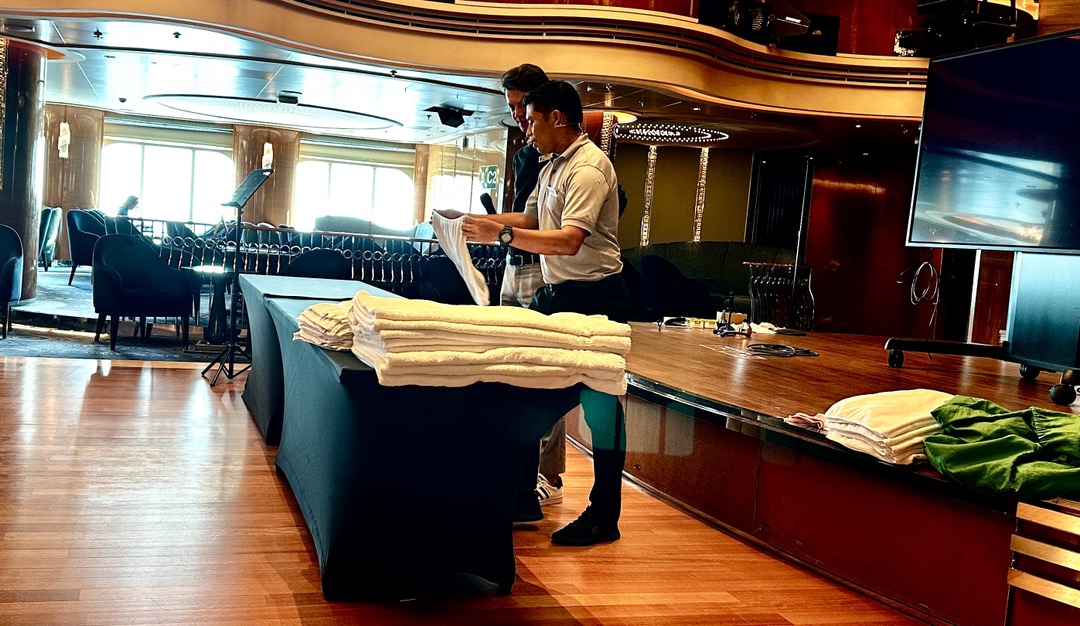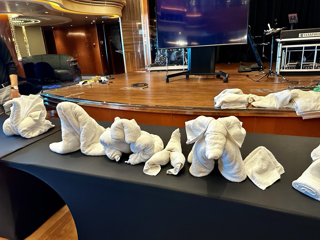 23 November 2024–Surprise!: We noticed this morning around 8:00 A.M. when we were supposed to dock at Sao Miguel, Azores, Portugal, that the ship was still moving. The location of our ship on our room TV showed that the ship was nowhere near the port of Sao Miguel. Rather, the ship was sailing south of the island. Sure enough, the Captain’s announcement began: “We are not able to dock at Sao Miguel today; we must unfortunately cancel this port.” When this cruise began, we were told that the enhanced disinfecting protocol had been enacted and that it was being enforced. This was due to several cases of “gastroenteritis” prior to getting to Rome. OK, then. We boarded later than we might have because the ship needed time to thoroughly disinfect from top to bottom. All sorts of health-related protocols have been in place since we boarded. But today…Port Authority at Sao Miguel asked our captain not to dock at their port because they did not want to introduce any illnesses to their island. They had had a fire about a year ago that “impacted their hospital,” and they do not have the resources to deal with widespread illness of any kind. So…we sailed all day. That’s fine, the activities director added some activities/programming, and away we continued. The weather is mild (around 70 F), but it was a little windy all night and all day. There have been some sprinkles, depending on our location at the moment/sunshine at other times/clouds at yet some other places. But the ship has been rocking. It’s kind of funny watching us trying to walk from place to place as if we were all drunk, really! To my knowledge, people aren’t getting sick to their stomachs or anything…. So, we missed our opportunity to hook into internet and cellphone coverage while being docked at port today. Rather, John and I will try to purchase a one-day service tomorrow, Sunday. Today’s activities were ship stuff, including presentations, even a towel animal demonstration. A sail away party was held on deck, but we did not go. From what Dad saw, it was not well attended. After all, we had already sailed away from Europe this morning when we did not stop at our very last opportunity. People did other things instead. One of the performers on the ship was to have disembarked in the Azores today, and he was unable to do so. For him, there are some problems that are quite costly because he not only has another contract in four days, but he also was to fly home to close on the sale of his house. Because his buyer does not want to wait until he has his next break after the holidays, the sale was cancelled. Uggh for this poor guy! Evidently, canceled port days are extremely expensive for the ship, too, because, for example, this particular stop might have been a provisions refill opportunity before heading out into the Atlantic where no land is available for a few days. Additionally, the ship will reimburse all Holland America Line endorsed excursions for its travelers, but these fees are not reimbursed by the tour providers to Holland America. Oh, well, these things do happen and are always a possibility on ships. We had a terrific day at sea, anyway. As Grandpa used to say, “que sera, sera.” P.S.: We are adjusting our time clocks back by one hour for the third time overnight. That means that by tomorrow morning, Sunday, November 24, 2024, we will be four hours ahead of all of you in the midwestern United States, not seven any longer!